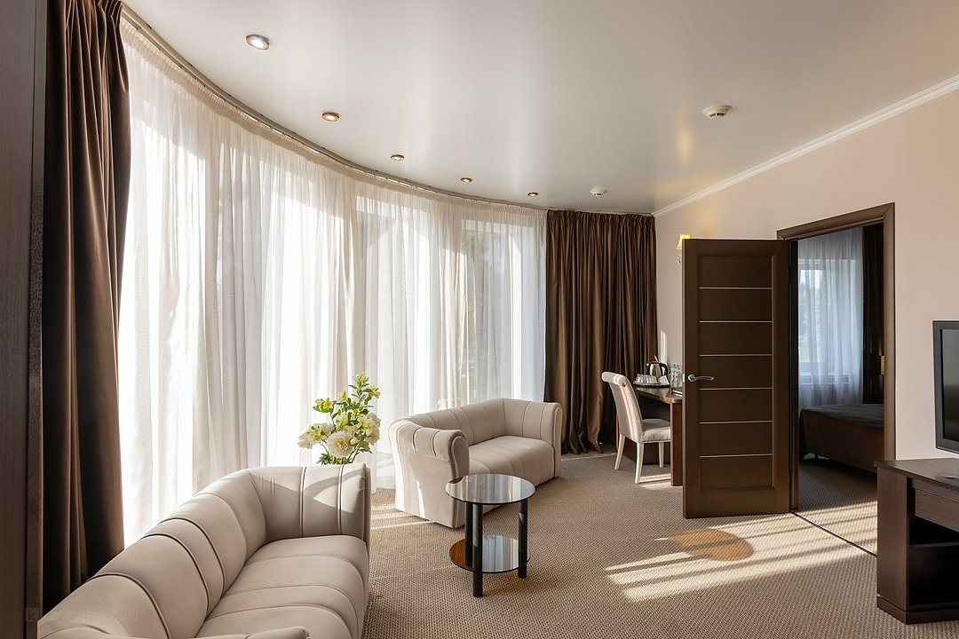 Двухкомнатный VIP-номер «Deluxe». В большой спальной комнате имеется удобная двуспальная кровать и ЖК-телевизор. В просторной гостиной зона отдыха оборудована мягким диваном, гардеробом, большим ЖК-телевизором со спутниковым ТВ. Высокие панорамные окна открывают вид на закат. В номере предусмотрены: электрический чайник, чай, питьевая вода, телефон, фен, кондиционер, холодильник, сейф и мини-бар. WiFi для всех гостей комплекса абсолютно бесплатно. Ванная комната оборудована угловой ванной. Для постояльцев VIP-номера "Делюкс" предоставляются халаты, тапочки, комплект полотенец и парфюмерии индивидуального пользования.Услуги и удобства