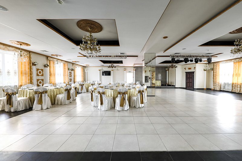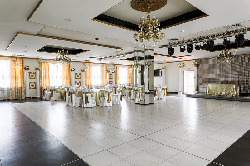 Роскошный банкетный зал в стиле барокко сделает ваше мероприятие незабываемым. Для комфорта гостей предлагается гардеробная комната, уборная и даже гримерка. Вместимость зала — до 130 человек.