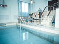 Сауна с большим бассейном и комнатой отдыха с мягкой мебелью. Возле бассейна тренажеры.