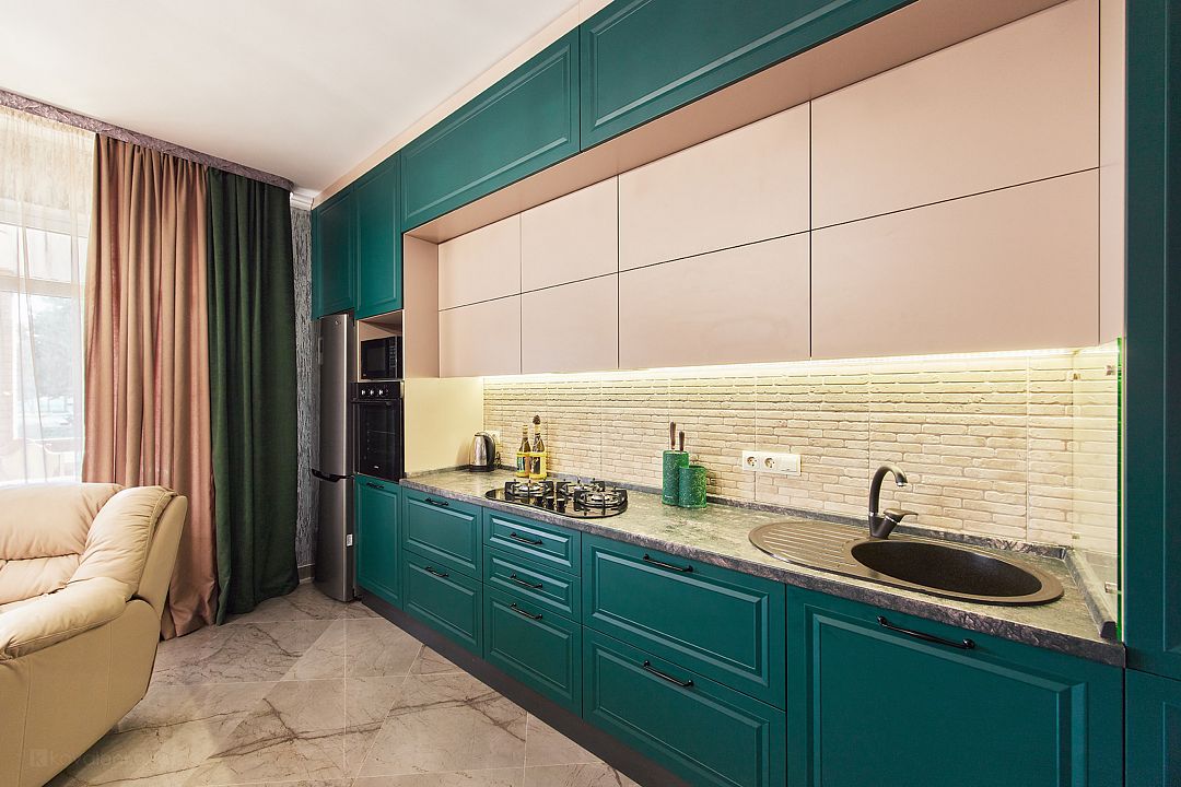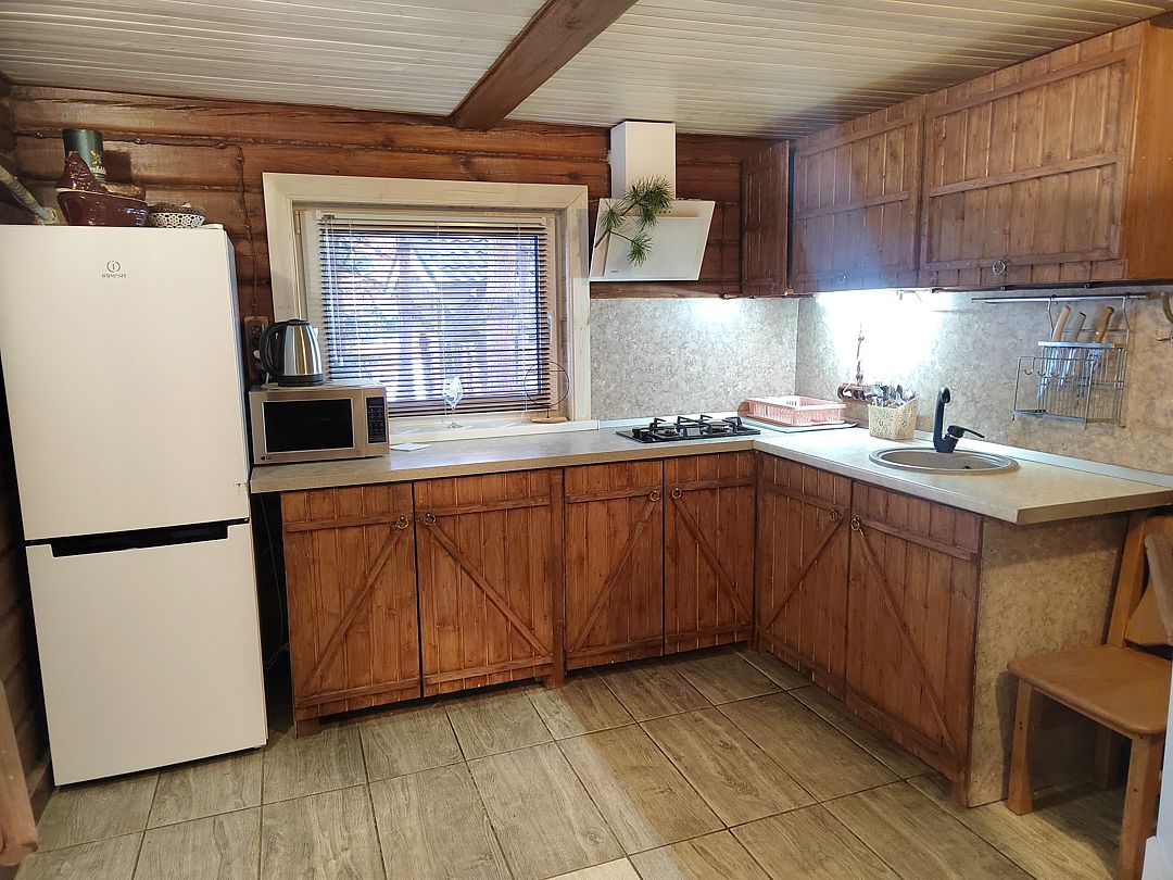 - Вся необходимая посуда и бытовая техника (свч, холодильник, газовая плита, вытяжка, электрический духовой шкаф, электрочайник).