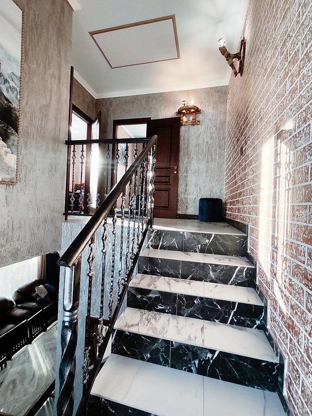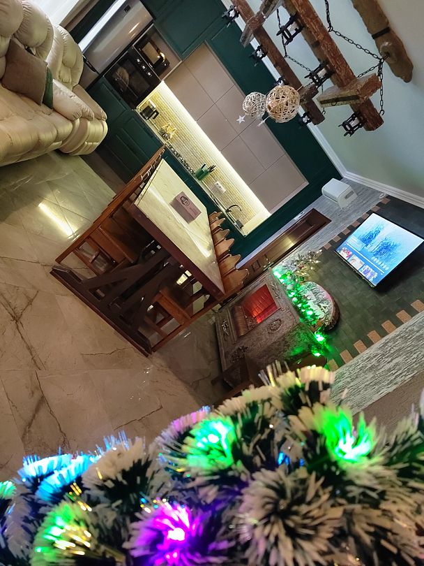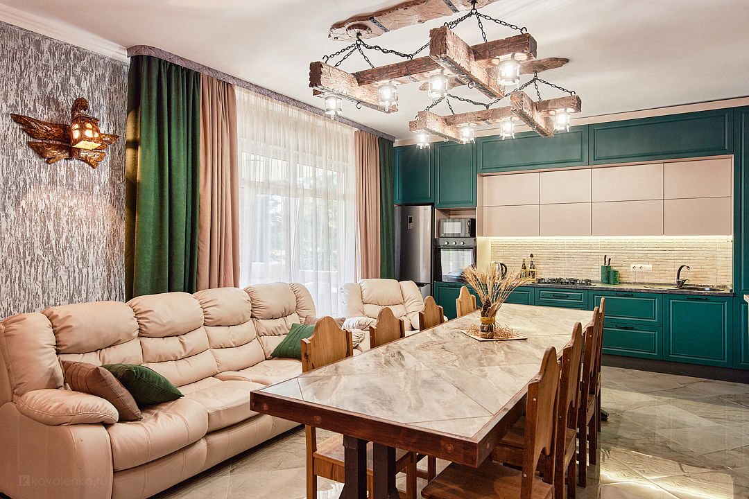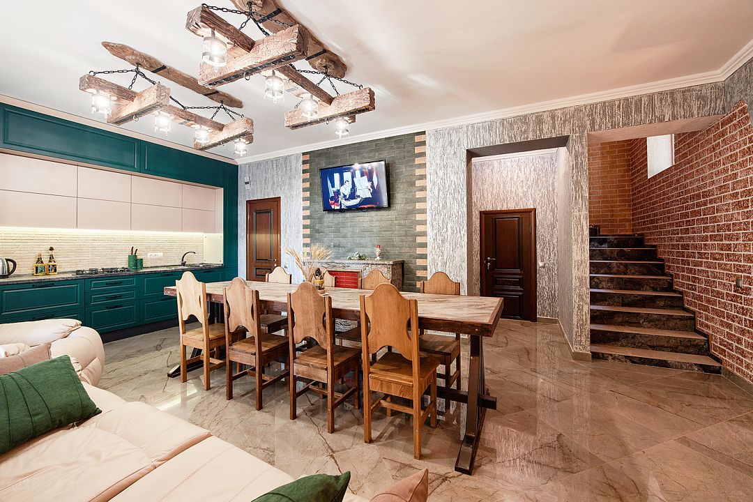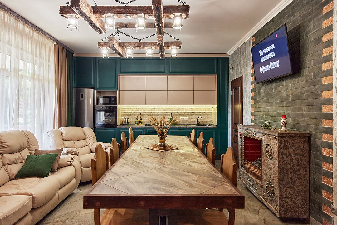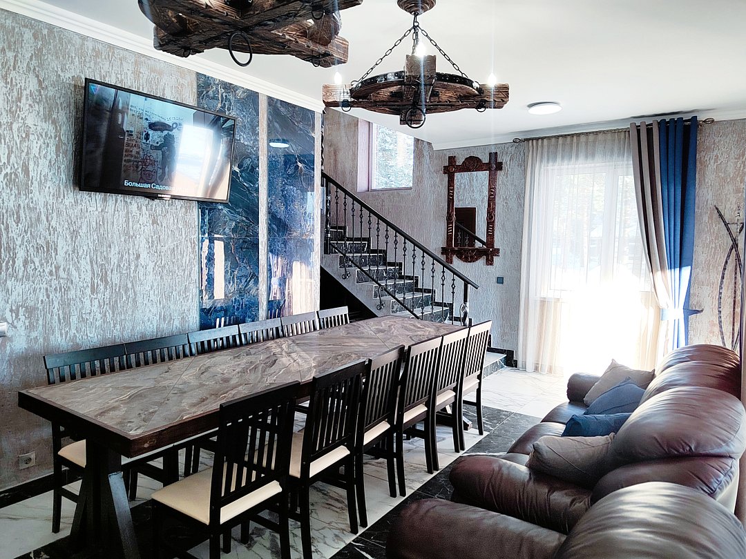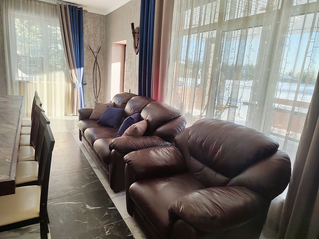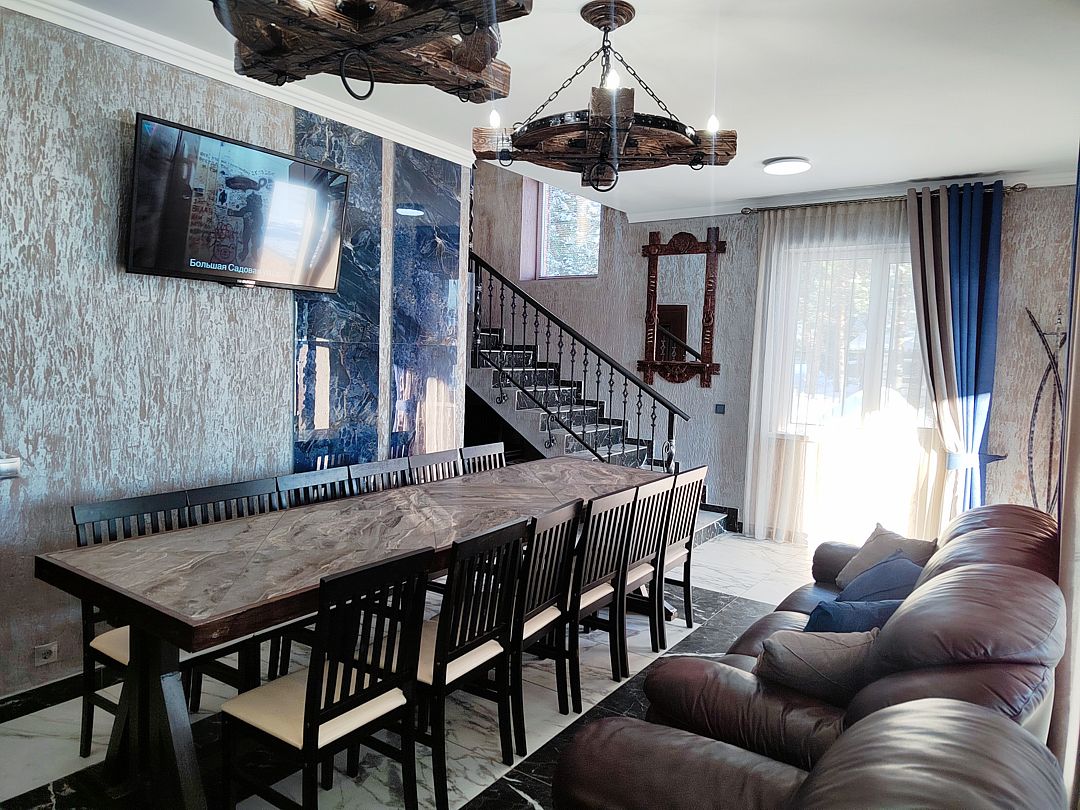 - На 1 этаже — большая гостиная с многофункциональный кухней и кожаным диваном + кресло. Стол 3 метра.