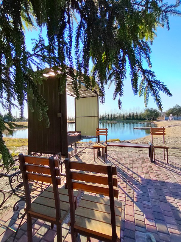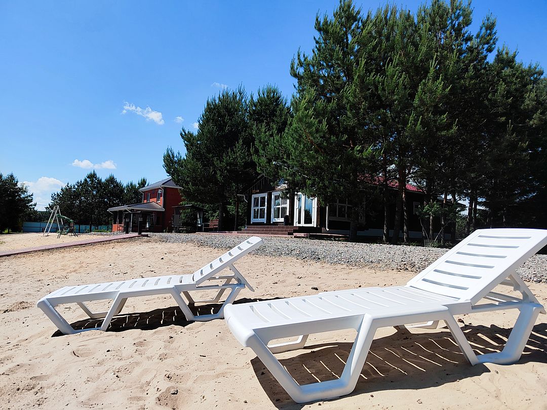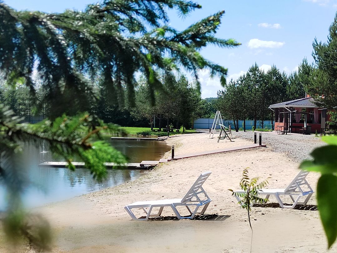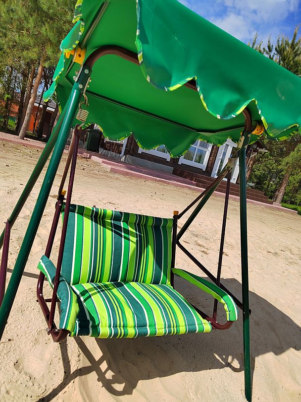- На прилегающей территории — песчаный пляж, качели, два пирса.