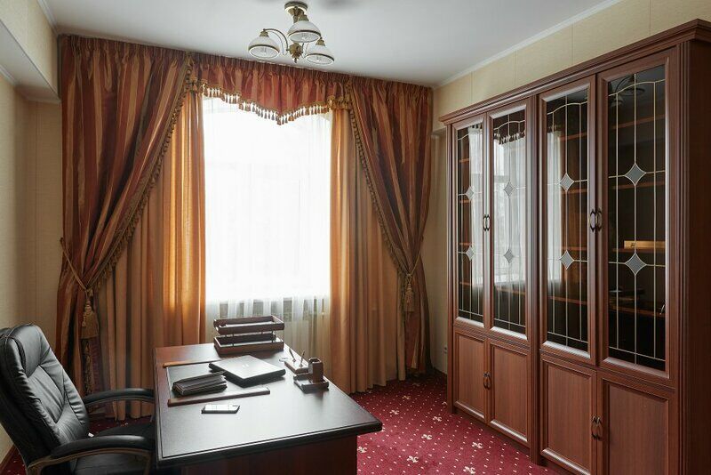 Шикарный интерьер, мраморная парадная лестница, богатые мебели в стиле шик 90х годов, на втором этаже балкон, что бы любоваться историческими зданиями, окружающими сквер.