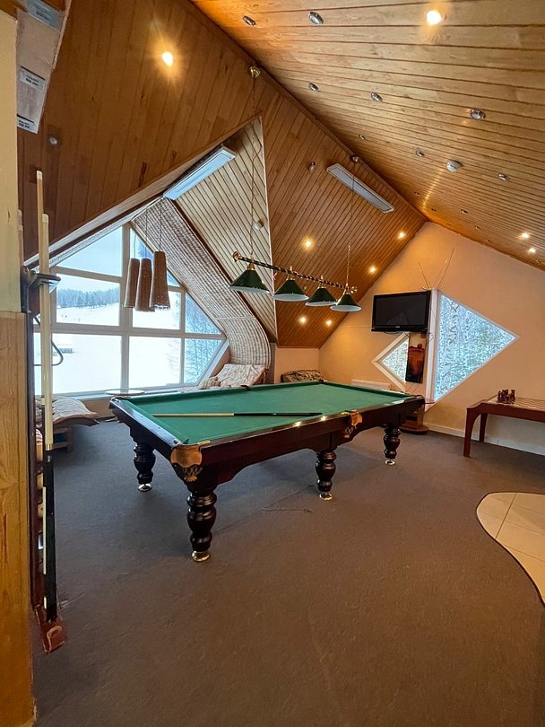 Трехэтажный коттедж. Просторная гостиная с камином, 5 комнат, двухуровневые кровати, бильярдный стол, кухня, 1 санузел с душевой, 1 санузел.