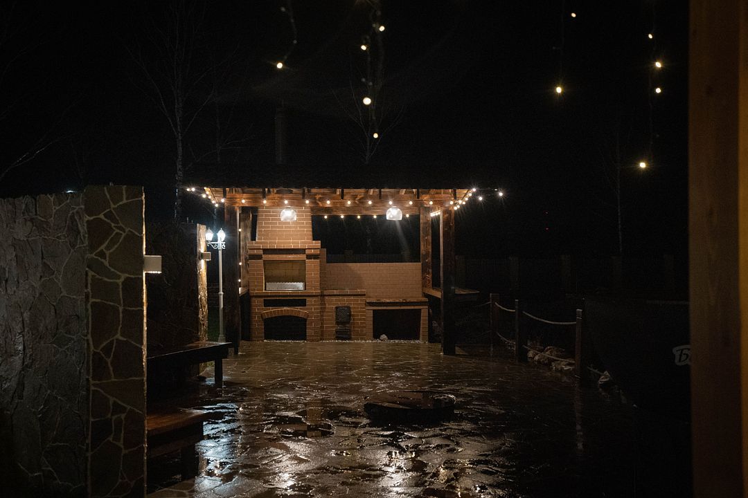Возле каждого дома есть мангал, где можно приготовить вкусные блюда на открытом огне, а рядом с баней обустроена просторная мангальная зона с костровой чашей. Если вы бронируете баню вместе с банным чаном, то можете воспользоваться этой зоной бесплатно.