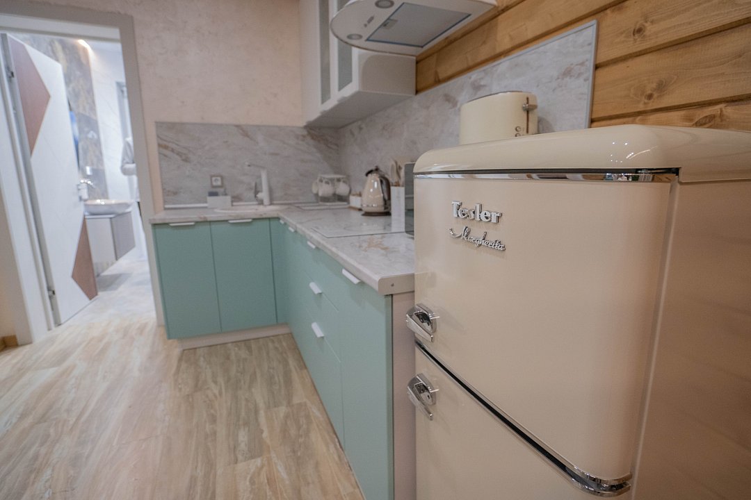 - кухня, оборудованная свч ,варочной поверхностью, тостером, чайником, холодильником,с красивой качественной посудой, бокалами