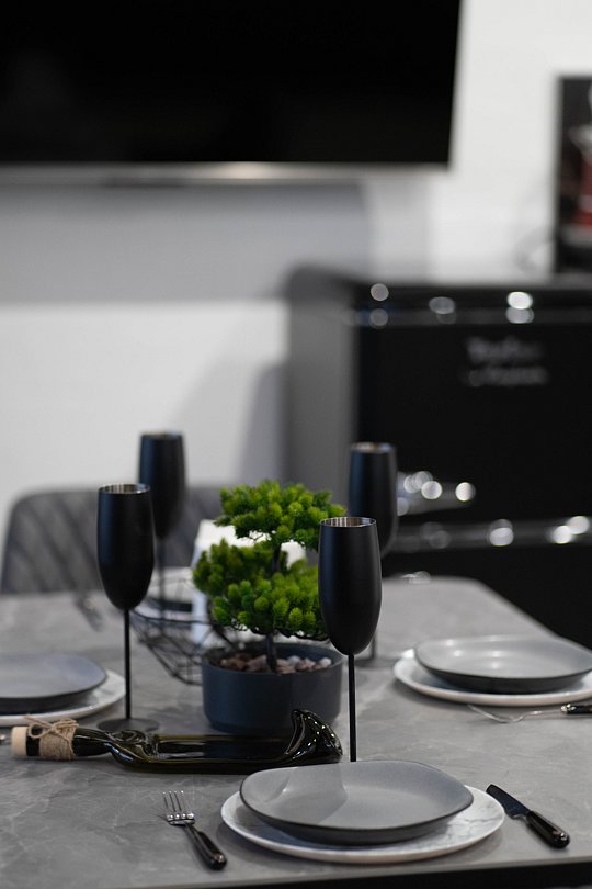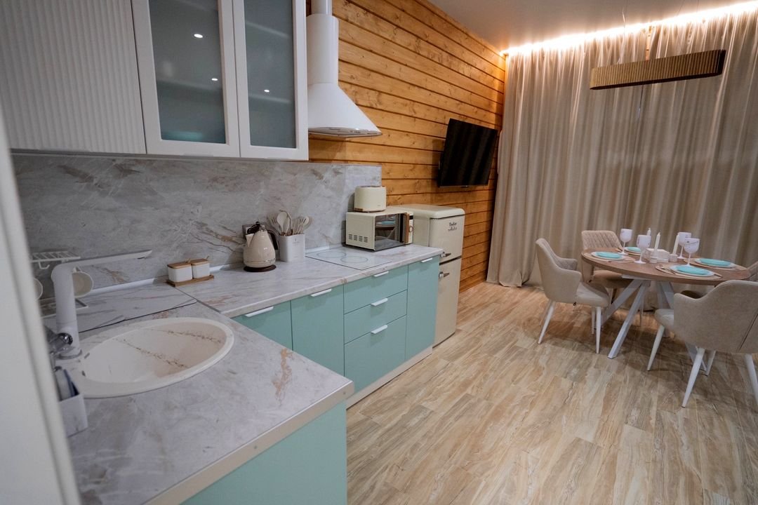 - кухня, оборудованная свч, варочной поверхностью, тостером, чайником, холодильником с красивой качественной посудой, бокалами;