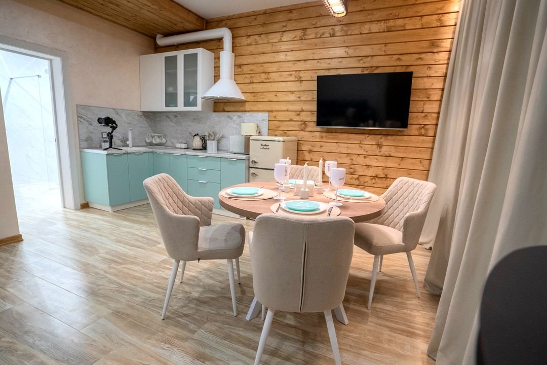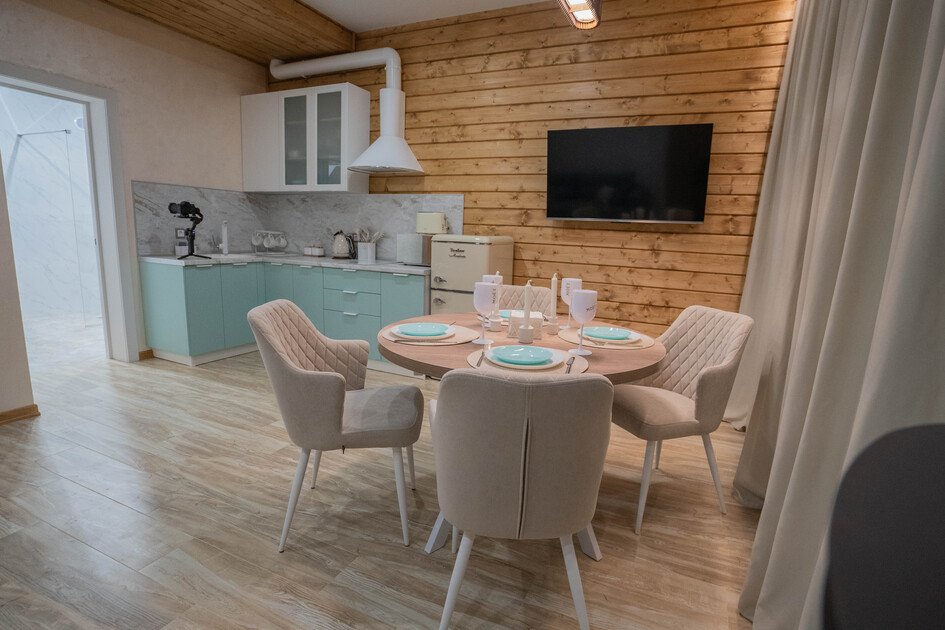 - кухня, оборудованная посудомоечной машиной, свч, варочной поверхностью, духовым шкафом, тостером, чайником, большим холодильником, с красивой качественной посудой, бокалами;