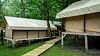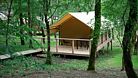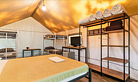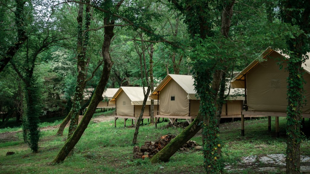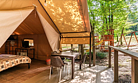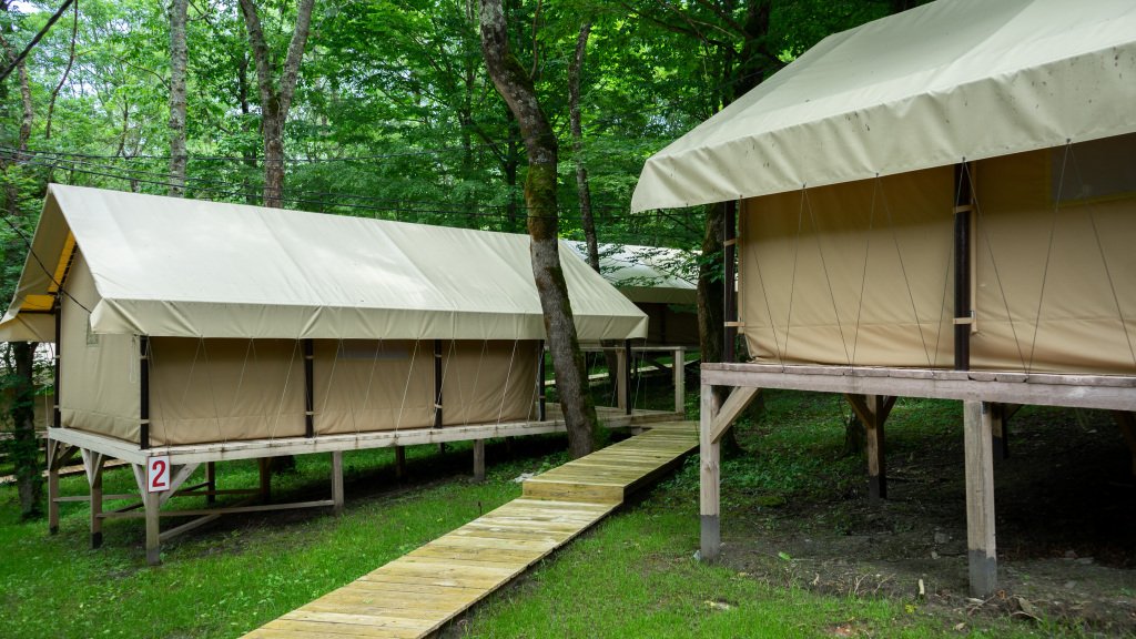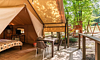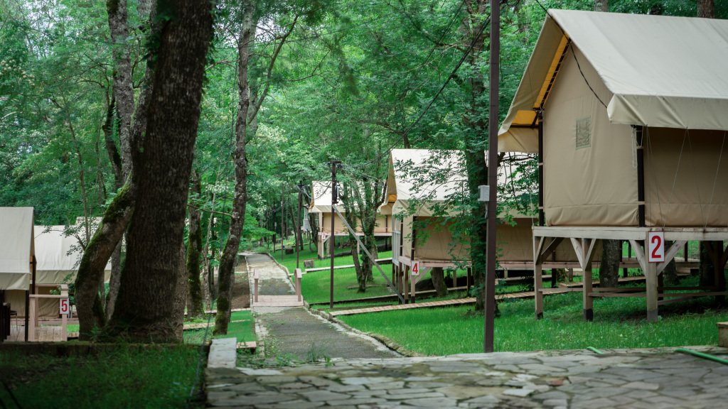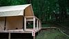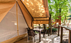 Уютный домик 20 м² с открытой террасой и видом на сосновый лес. Внутри — большая двуспальная и двухярусная кровати, стол, четыре стула, открытый шкаф, пуфики и вешалки. Есть вентилятор, холодильник, Wi-Fi и внутренний телефон. Включена регулярная уборка.
