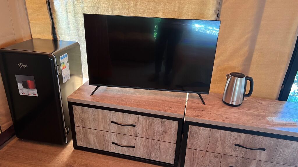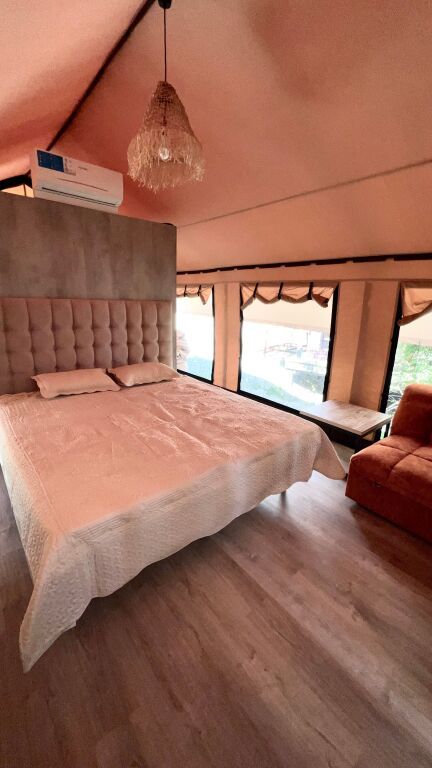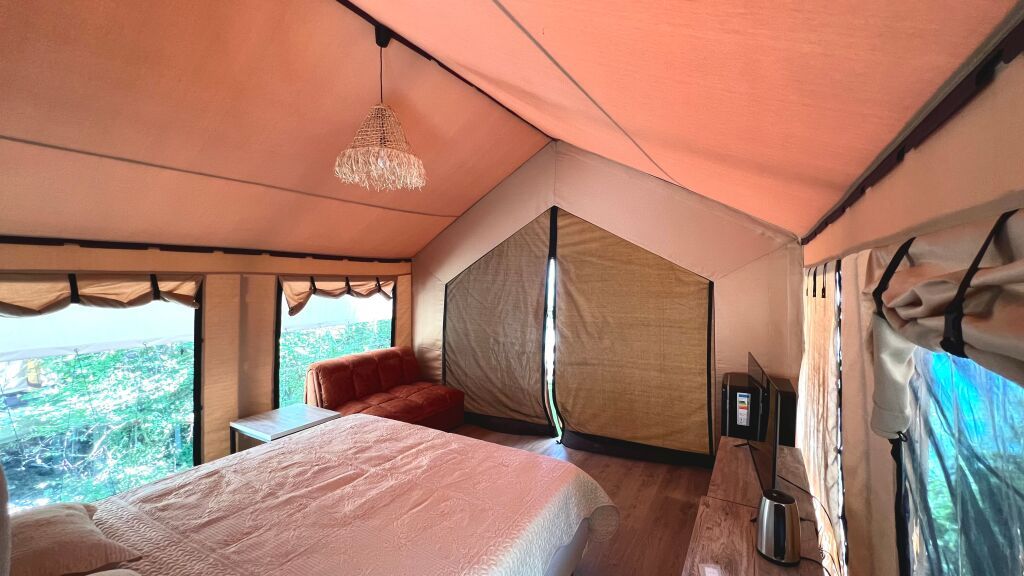 Сафари-лодж премиум класса со всеми удобствами в номере. Оборудован современной душевой комнатой. сплит-системой, электрическим чайником. холодильником, гардеробом, двуспальной кроватью с постельным бельем премиум класса и удобными ортопедическими матрасами, раскладным диваном для дополнительного места.