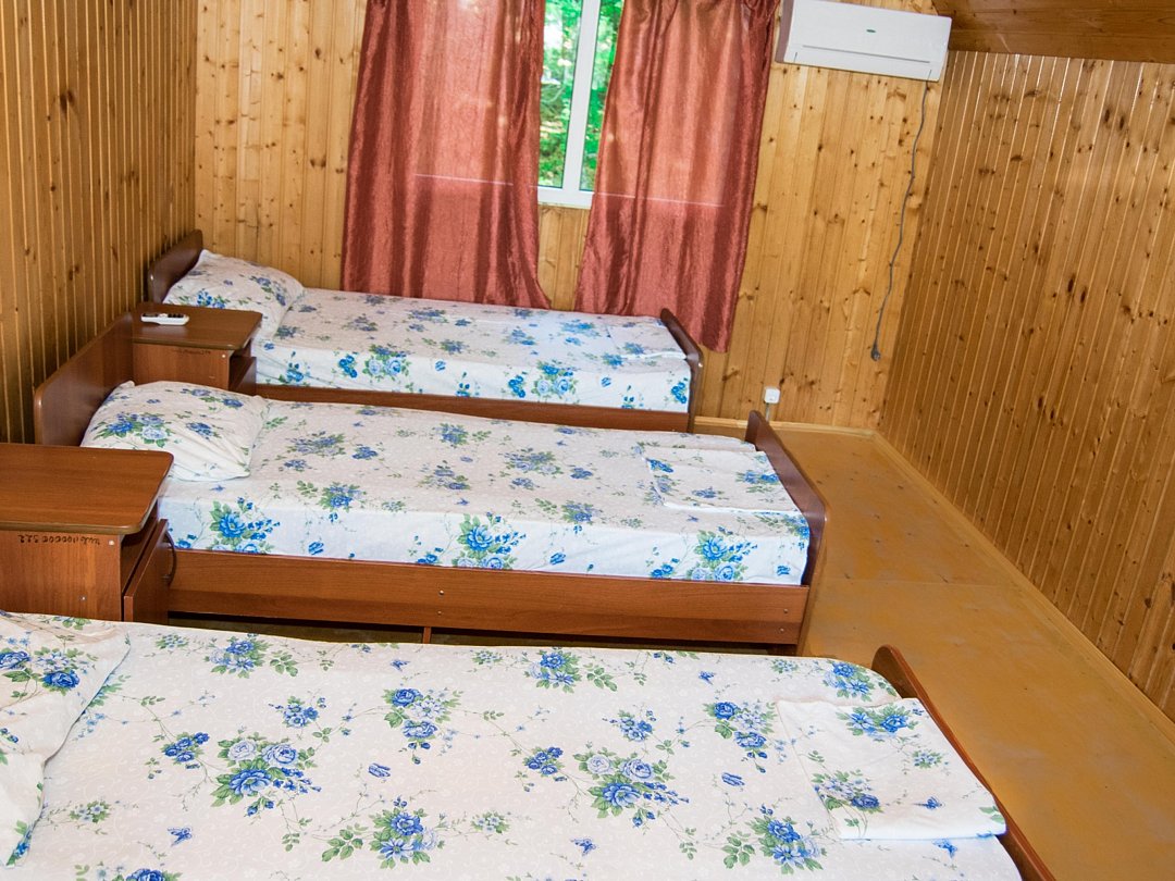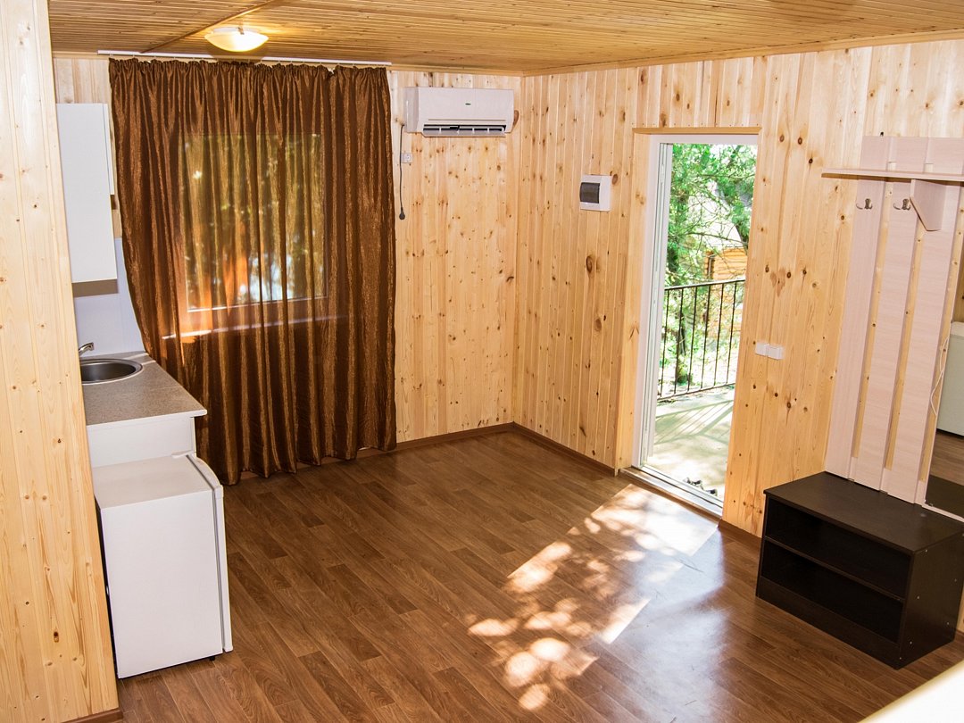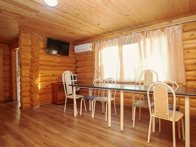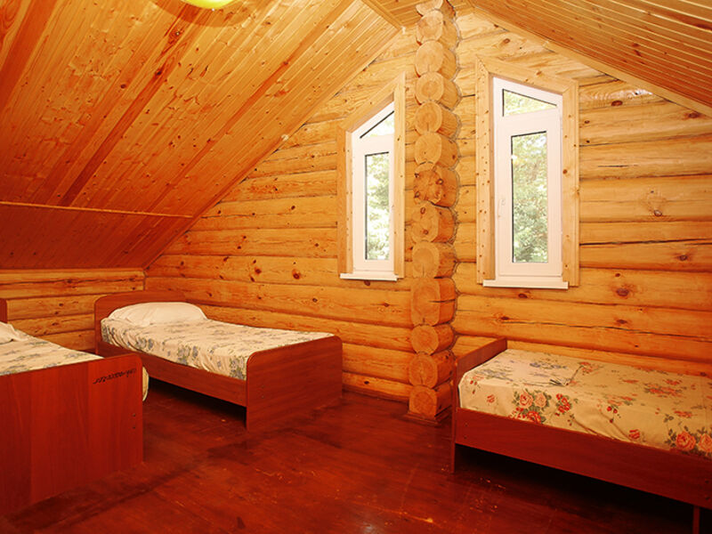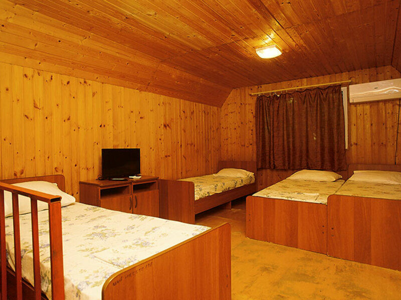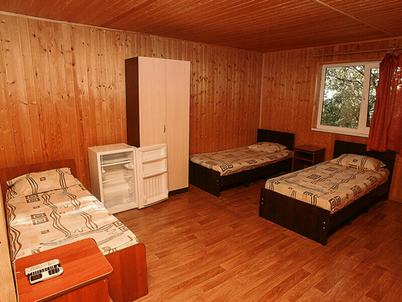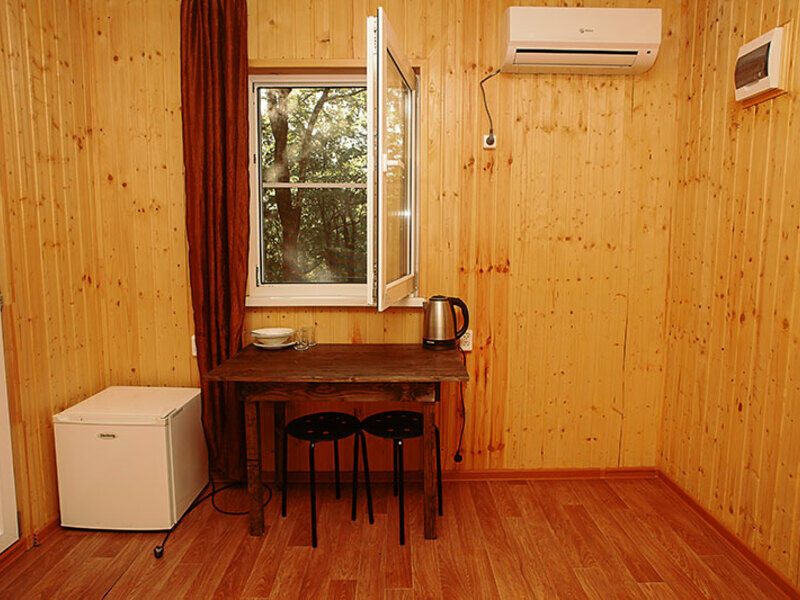 Бунгало с видом на море - это уникальный объект на нашей базе. Комфортабельный двухэтажный деревянный дом, собранный из цельного бруса. Запах натурального дерева создает непередаваемую атмосферу лесной хижины, но со всеми современными условиями. Идеально подходит для длительного проживания большой компании или большой семьи. Дом имеет две жилые комнаты, кухню-гостинную, два туалета, душевую. На втором этаже - две жилые комнаты и просторный холл. Все помещения оснащены кондиционерами. Кухня-гостинная оснащена небольшим кухонным гарнитуром, холодильником, чайником, микроволновкой, шкафчиками для посуды, телевизором. С южной стороны бунгало находится терраса с панорамным видом на море и окружающий лес. Рядом с домом можно припарковать автомобили проживающих гостей, а также оборудовать индивидуальную мангальную зону. Рядом с домом начинается спуск к морю, вам не придется идти через всю территорию базы.В номере