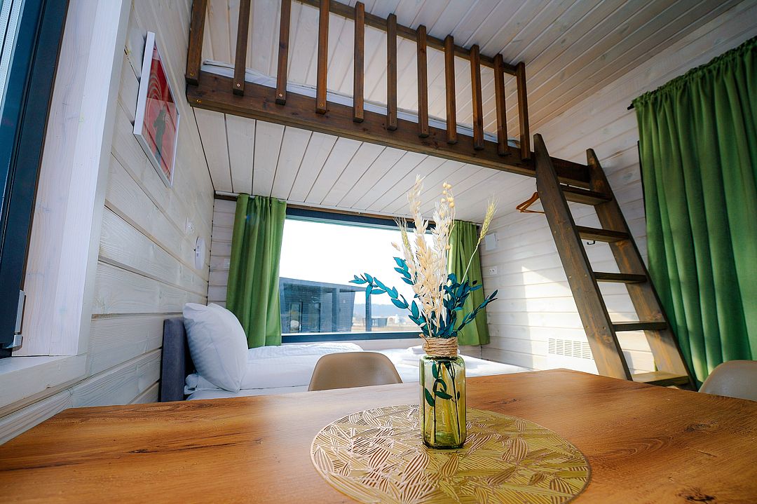 Домик крохотный, но есть все необходимое - душ с водонагревателем, туалет, теплый пол в ванной, и в зоне кухни, обогреватель, индукционная панель, чайник, фильтр для воды (!), стол, стулья, сетки на окнах, многоуровневое освещение, кресла-мешки на терраске, двухспальный диван и двухспальное детское место наверху (вот там, правда, тесновато и душновато, но детям понравилось, главное, безопасно, свалиться нельзя).