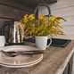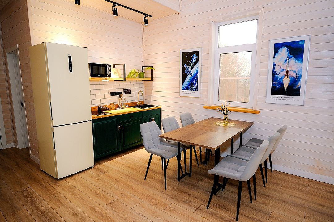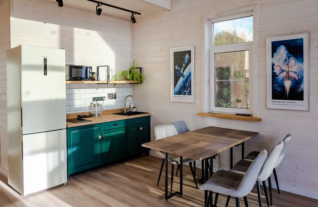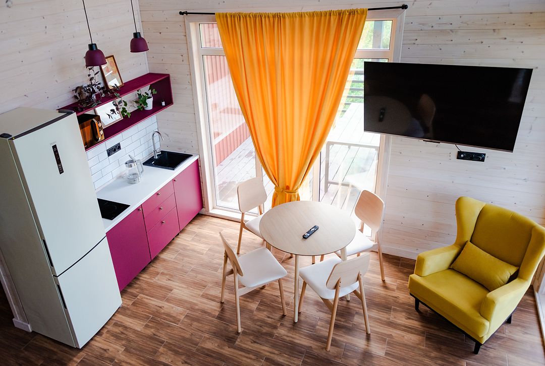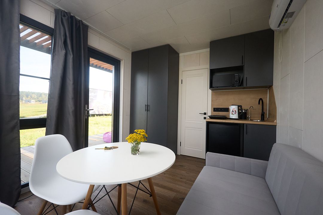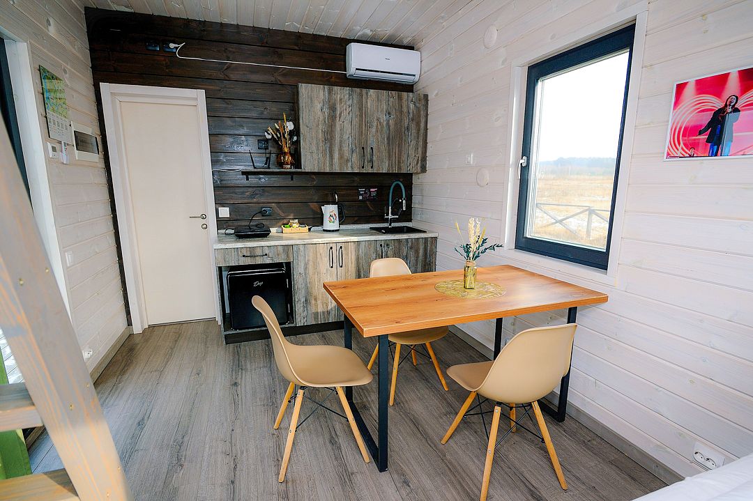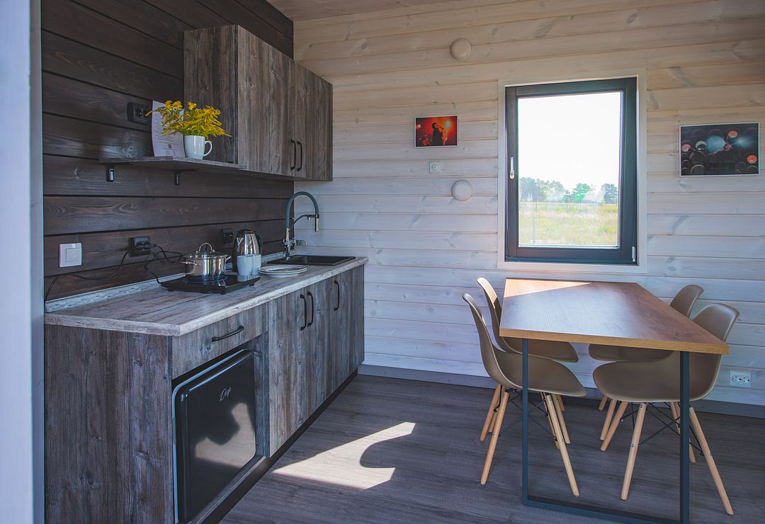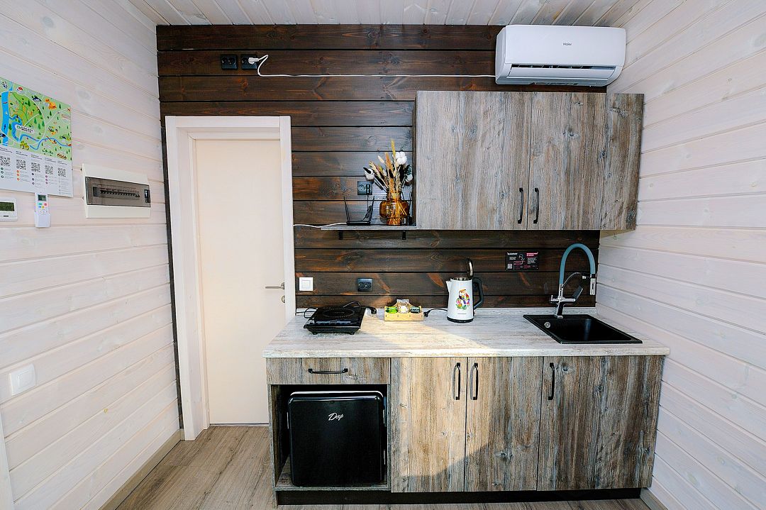 В каждом домике есть своя небольшая кухня со столом, стульями, холодильником, одноконфорочной индукционной плитой, раковиной с фильтром для воды и всем, что необходимо: чайник, сковорода, кастрюля, доска, приборы и посуда.