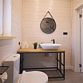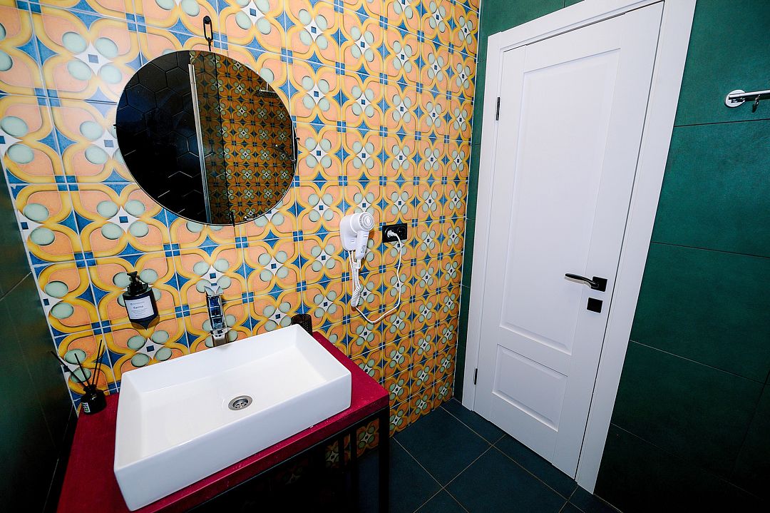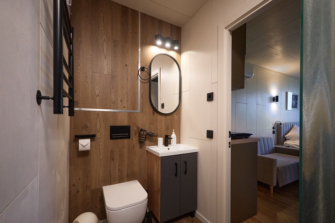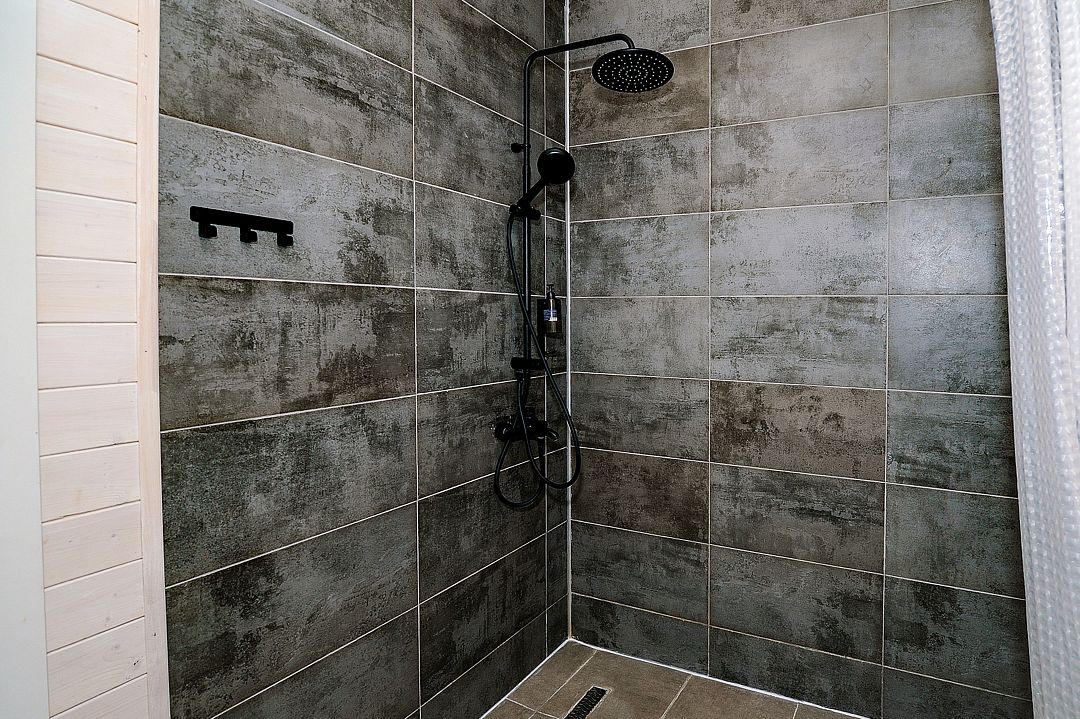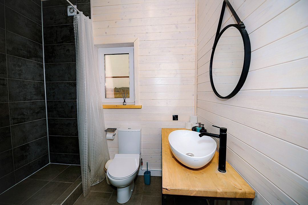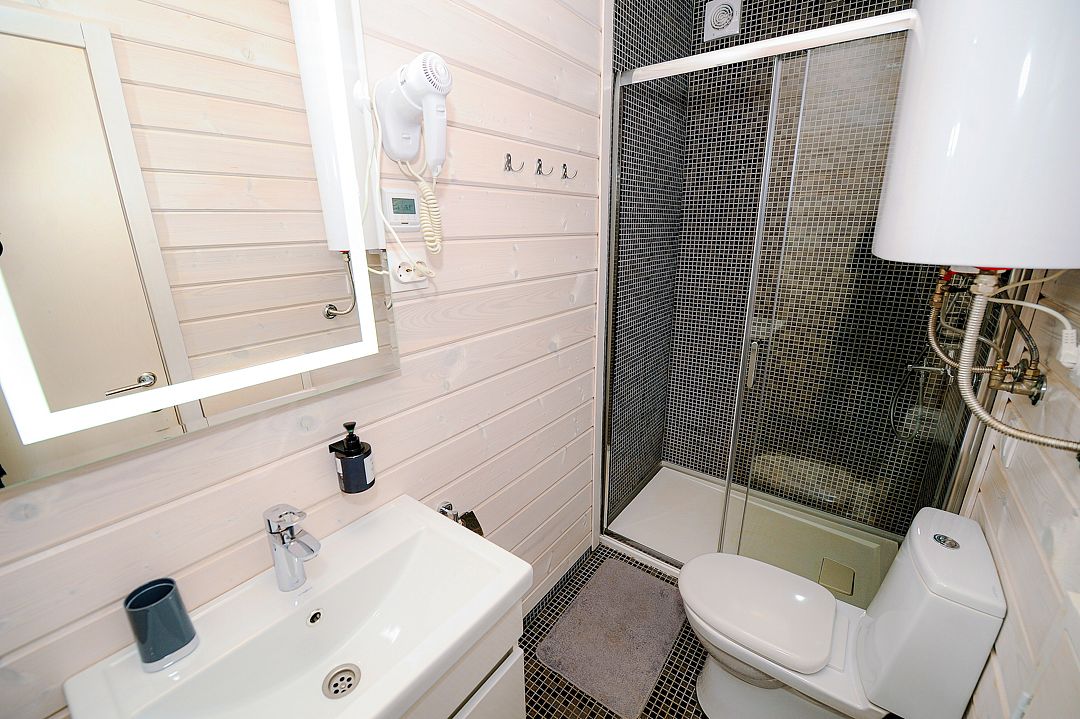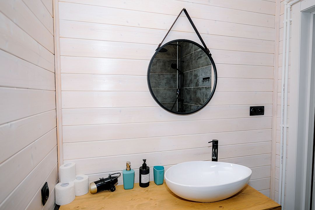 В домике есть ванная комната, в ней — душевая кабина, туалет, раковина с зеркалом, фен, полотенца и гель для душа.
