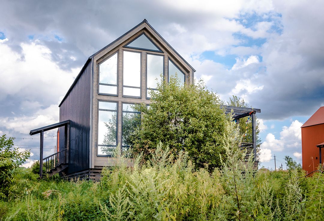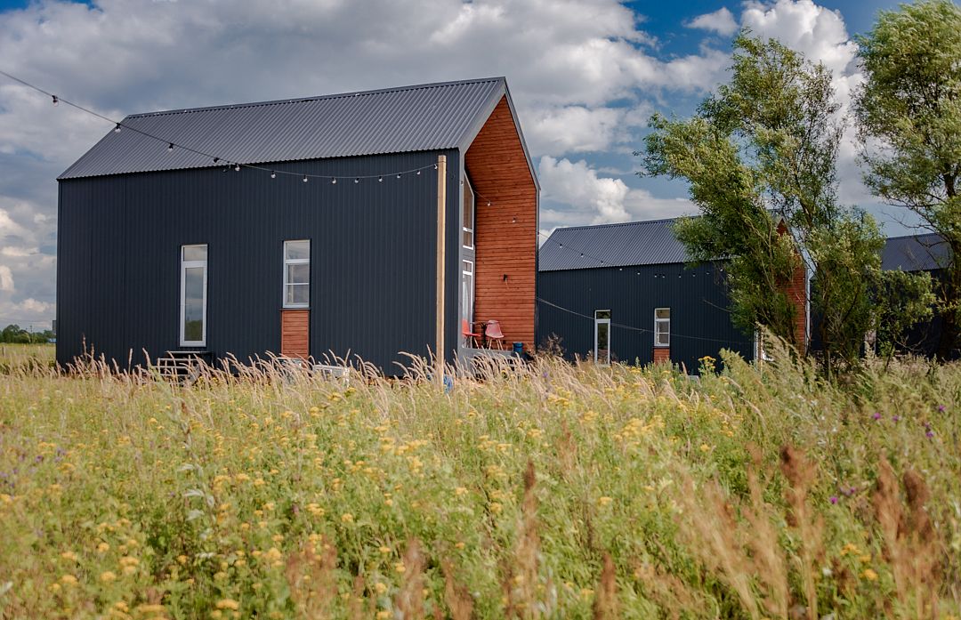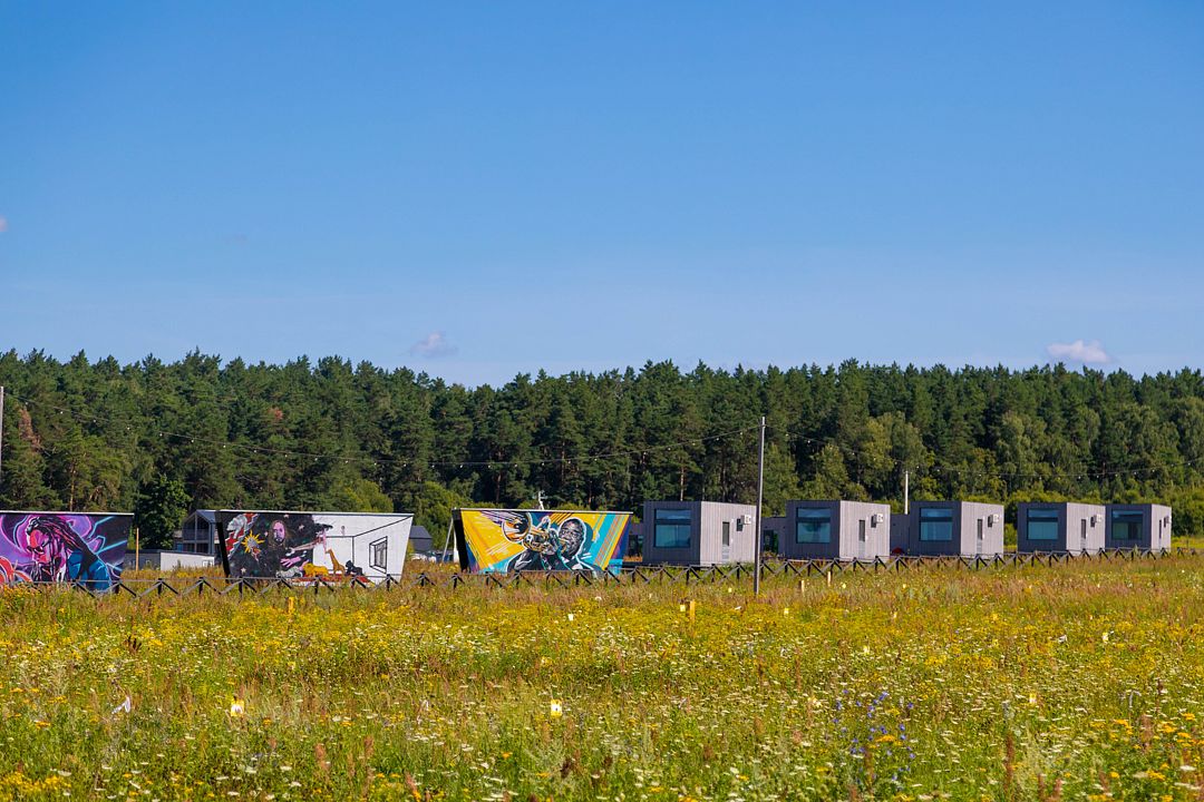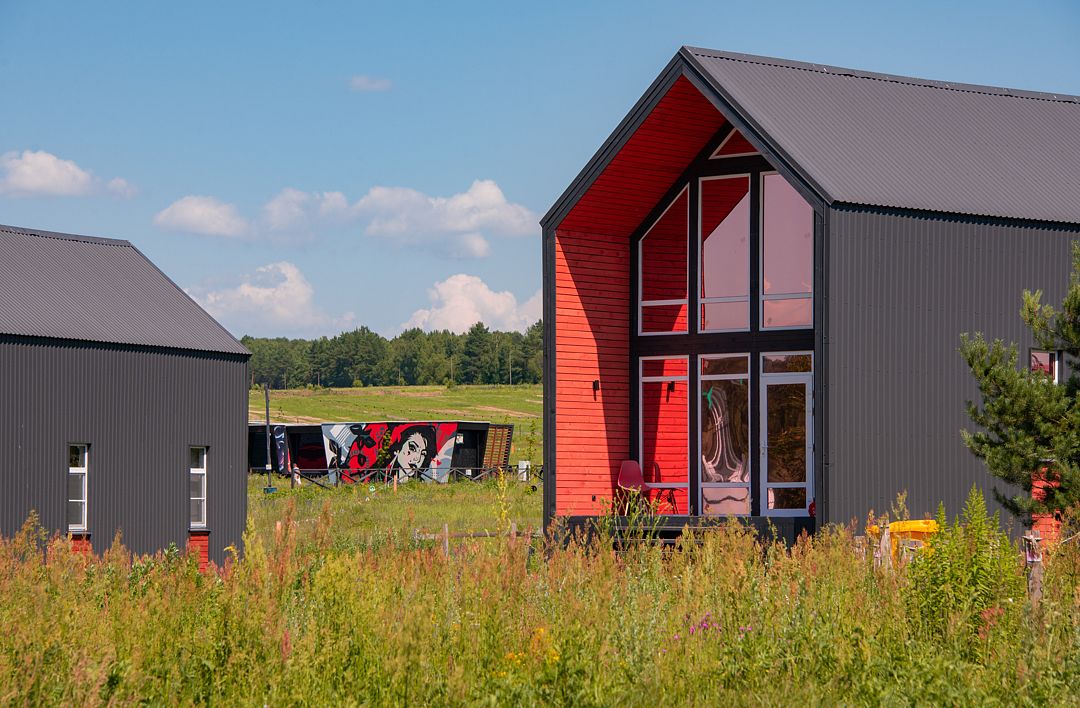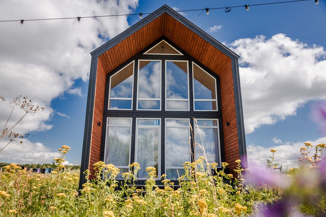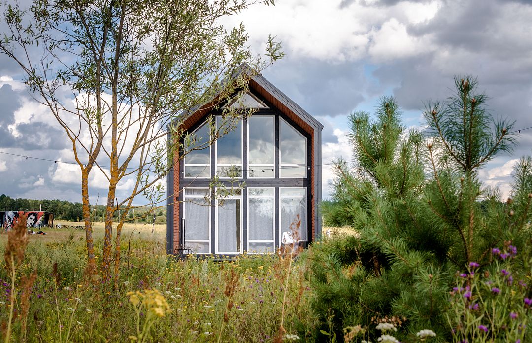 Дома стоят посреди поля легендарного фестиваля «Дикая Мята», в окружении леса и реки, из каждого окна открывается живописный вид.