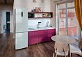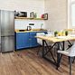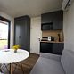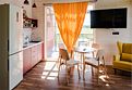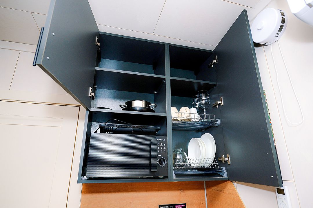 - кухня-гостиная: большой обеденный стол, двухкамерный холодильник, микроволновка, индукционная плита, раковина с фильтром для воды и все, что необходимо (чайник, сковорода, кастрюля, доска, приборы и посуда), а также раскладной диван (спальное место 135 см.), место для хранения вещей и телевизор со Smart TV;