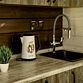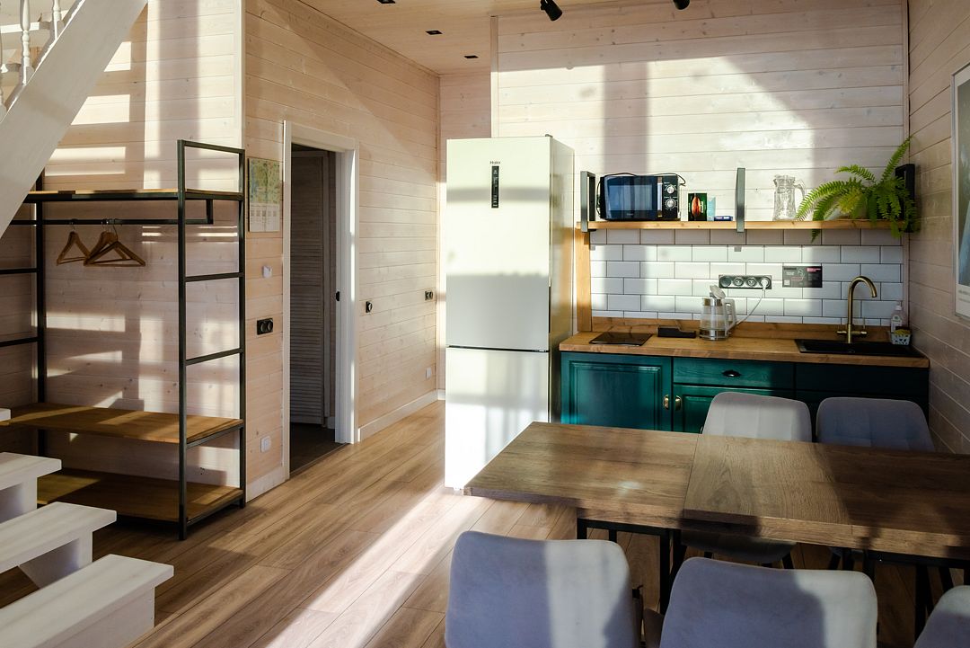 В домике есть своя небольшая кухня со столом, стульями, холодильником, одноконфорочной индукционной плитой, раковиной с фильтром для воды и всем, что необходимо: чайник, сковорода, кастрюля, доска, приборы и посуда.