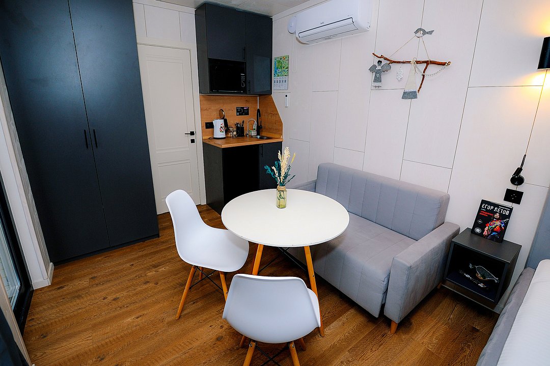 1-комнатный дом-студия — комфортное размещение вдвоем или с ребенком для любителей быть в центре развлечений. Возможно дополнительное размещение 1 человека на диване.
