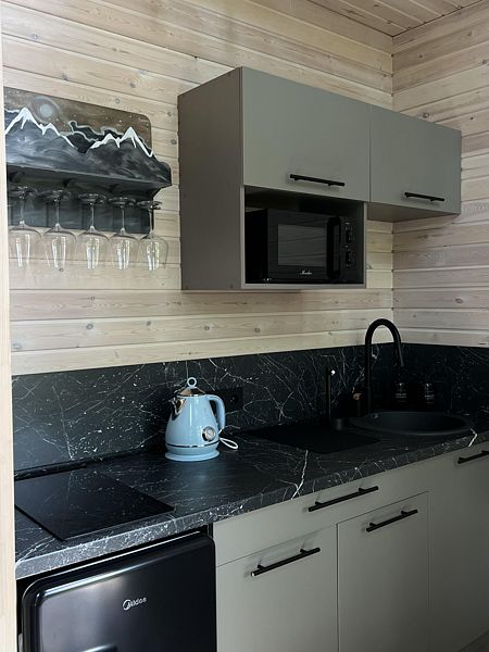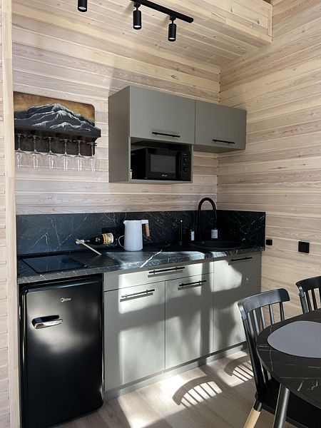 - кухня-гостиная с раскладным диваном. На кухне есть плита, холодильник, микроволновая печь, капсульная кофемашина, чайник и вся необходимая утварь для приготовления самого вкусного ужина;