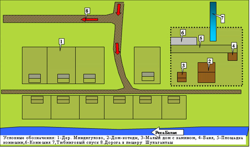 Уфа (выезд из Уфы в сторону аэропорта)-Булгаково(проезд направо под мостом, по указателям Белорецк)-Архангелск-Инзер-Межгоръе(через 35 км ,от зеленой заправки «Башнефть» проезд направо, ч-з 3 км, проезд направо по указателям Старосубхангулово)-Узян-Кага (после проезда кагинского водохранилища, проезд налево)-Байназар-Старосубхангулово (проезд 2 км до автостанции, проезд направо в гору, 10 км)-Миндигулово(на указателе написано Миндигол, с левой стороны деревни-турбаза «Каповатур», новые здания с зеленой крышей) – 380 км.