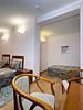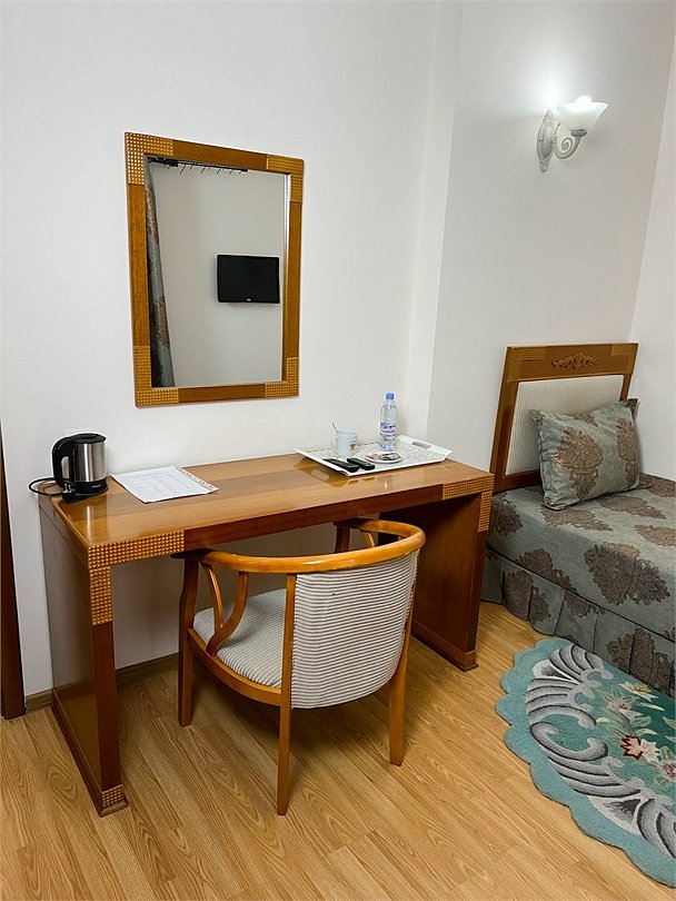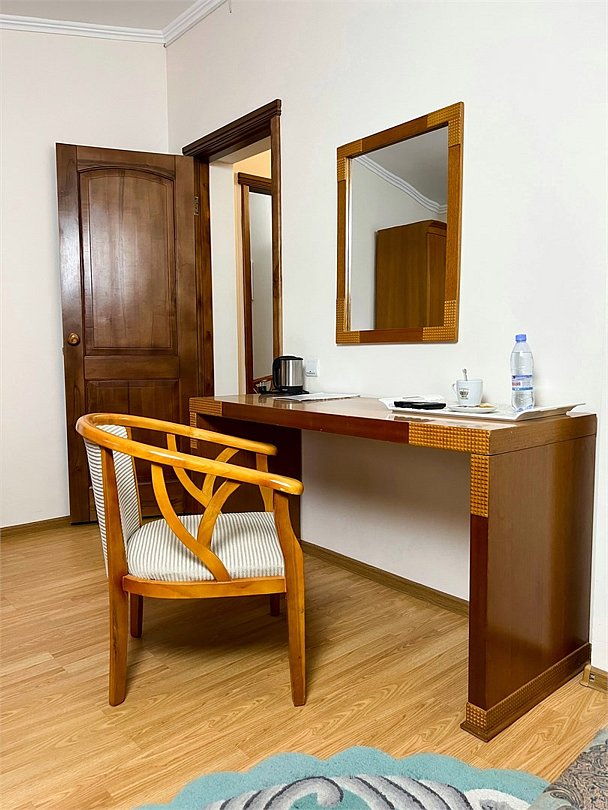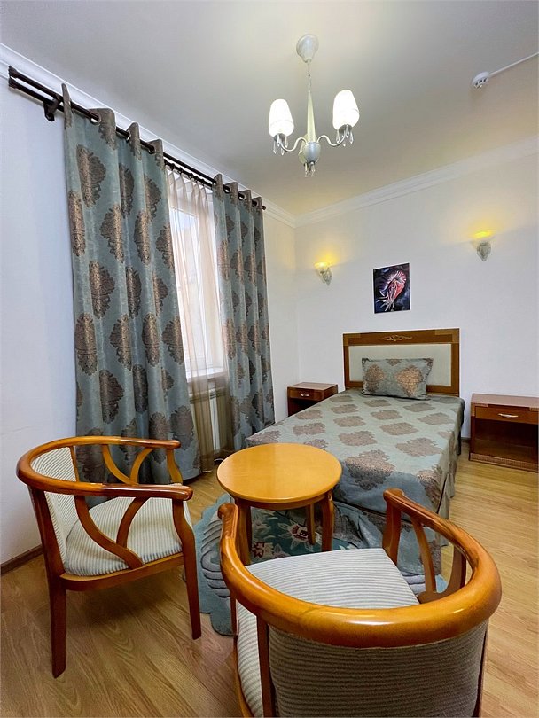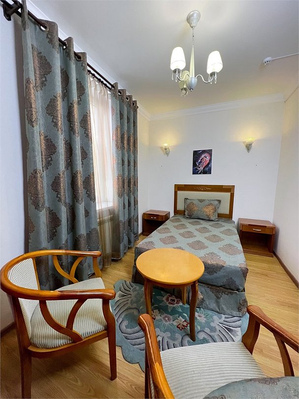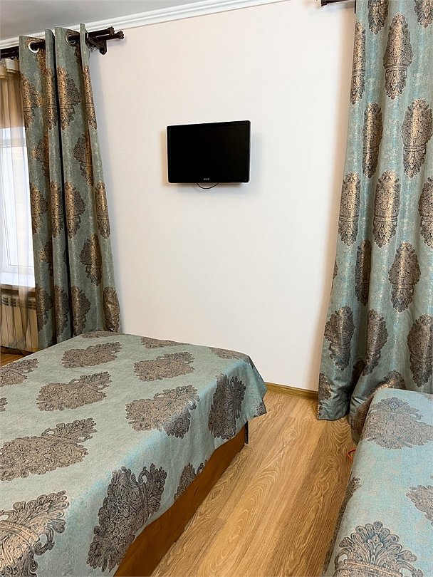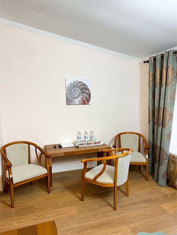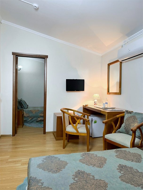 Четырехместный, двухкомнатный, просторный номер с удобными односпальными кроватями рабочими столами, двумя креслами и столиком, двумя ЖК-телевизорами и компактным туалетом, который совмещен с умывальником и душем. Идеальный вариант для командировочных поездок, А так же останавливающимся в отеле на короткое время.