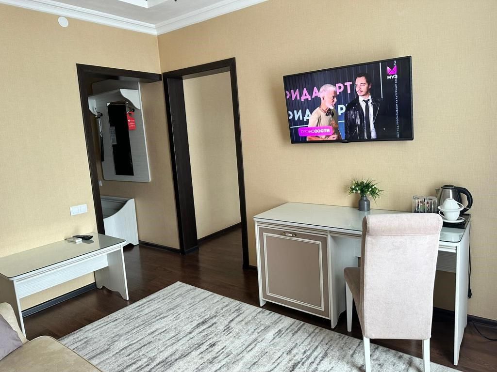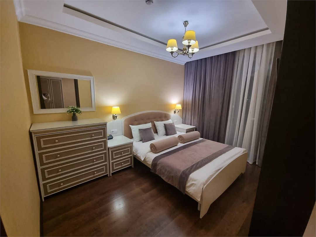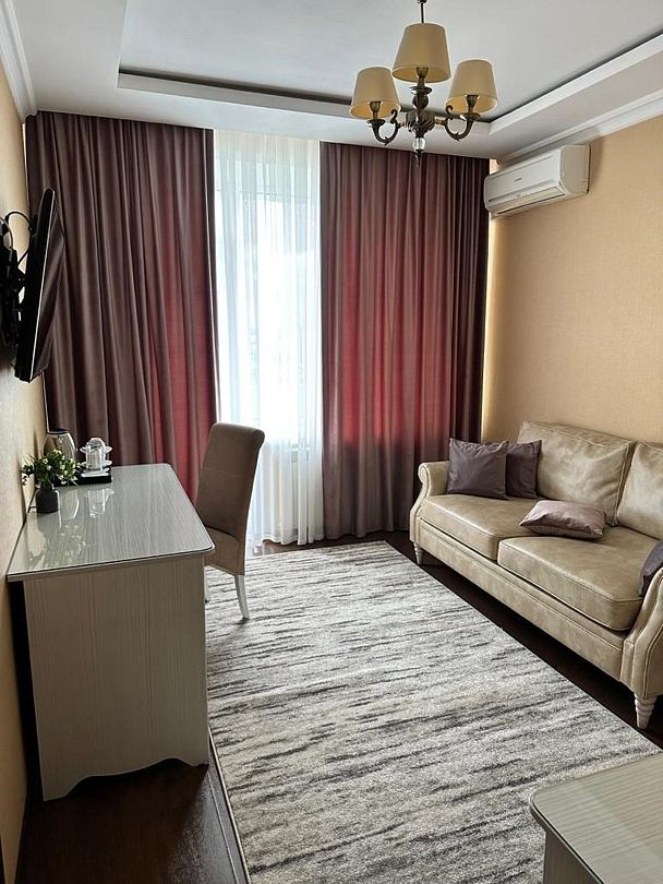 2-спальная кровать, раскладной диван, ТВ, кондиционер, мини-колодильник, кухонная зона, фен, гигиенические принадлежности, тапочки, халаты, с/у с ванной