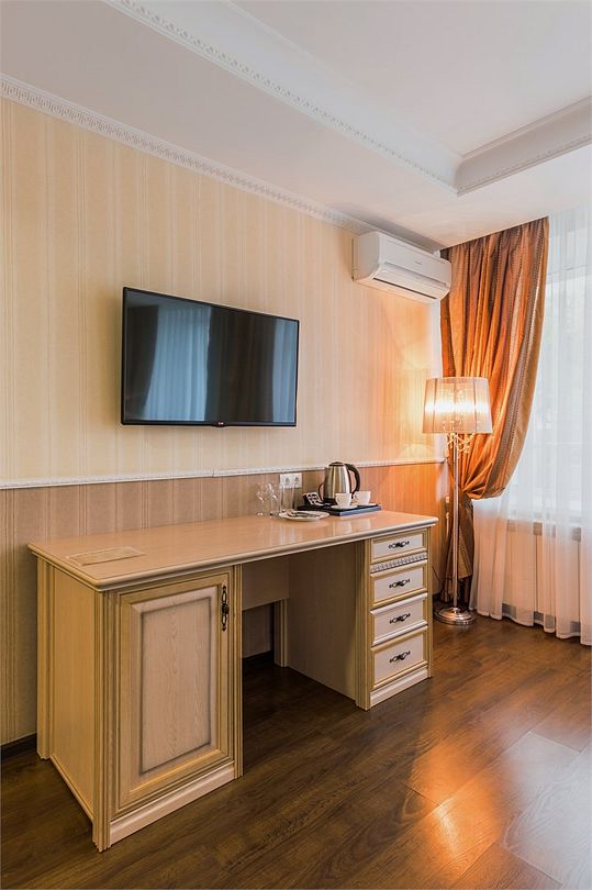 Wi-Fi, кондиционер, электронные замки, ванная комната, ванна, халаты, банные полотенца, тапочки, косметические средства, двуспальная кровать, письменный стол, багажная тумба, зеркало, унитаз, раковина, кулер на этаже, стул, вид на парк, внутренний телефон, телевизор с плоским экраном, шкаф-купе, мылоВ гостиничном номере