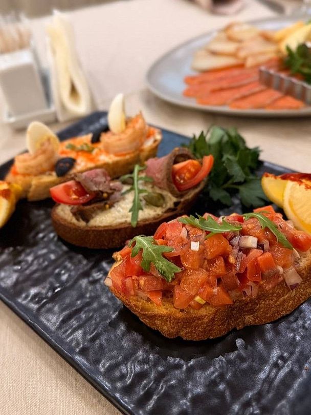 Завтрак в формате «Шведский стол» предлагает гостям богатый выбор холодных и горячих блюд, а также свежую домашнюю выпечку. В будние дни трапеза доступна с семи до десяти утра, а в выходные и праздники гостям предлагается изысканный комплексный завтрак.