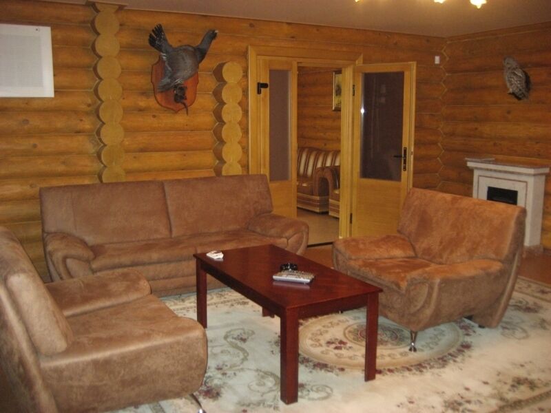 Небольшое деревянное бревенчатое здание в деревенском стиле.Большой удобный круглый вращающийся стол, за которым может разместиться 15 человек, далее - комната для переодевания, растапливаемая дровами парная, глубокий бассейн с прохладной водой.