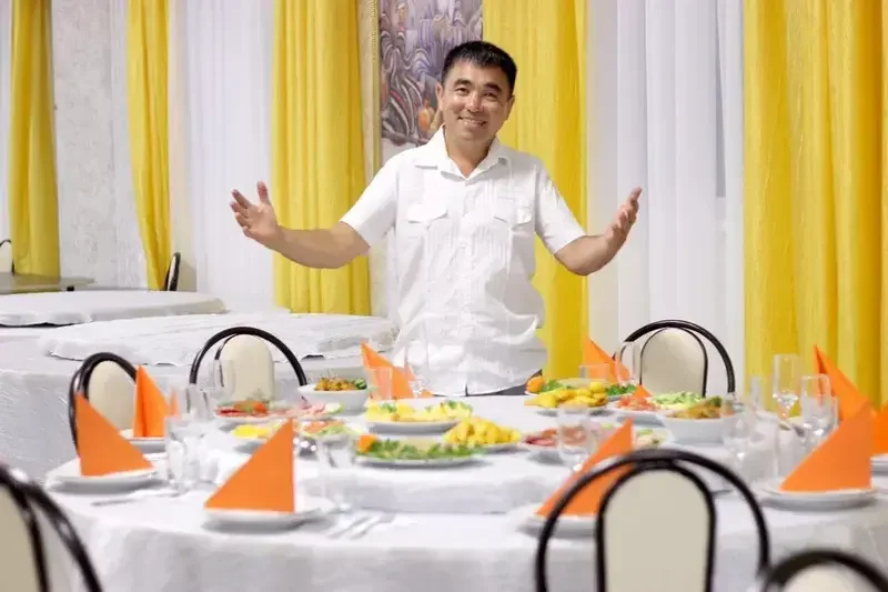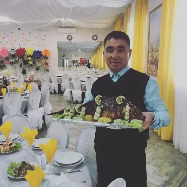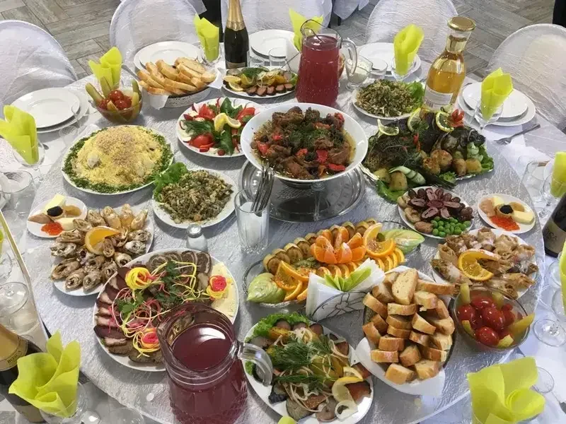 В просторном банкетном зале предлагается полноценный стол, включающий два горячих блюда (шашлычное ассорти, манты и другие) на выбор из баранины или говядины, два салата и четыре нарезки (овощная, фруктовая, мясная и рыбная).