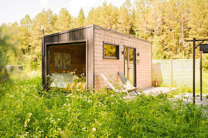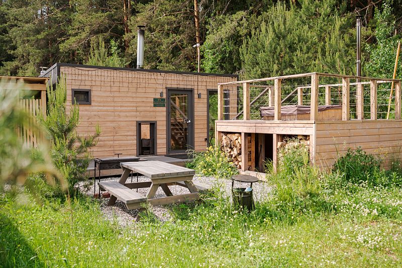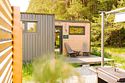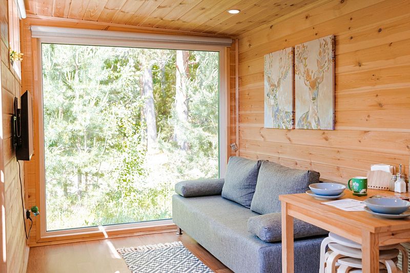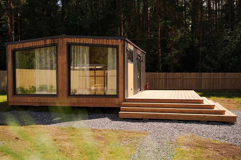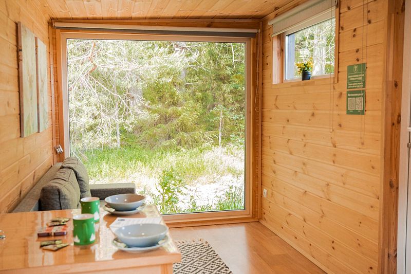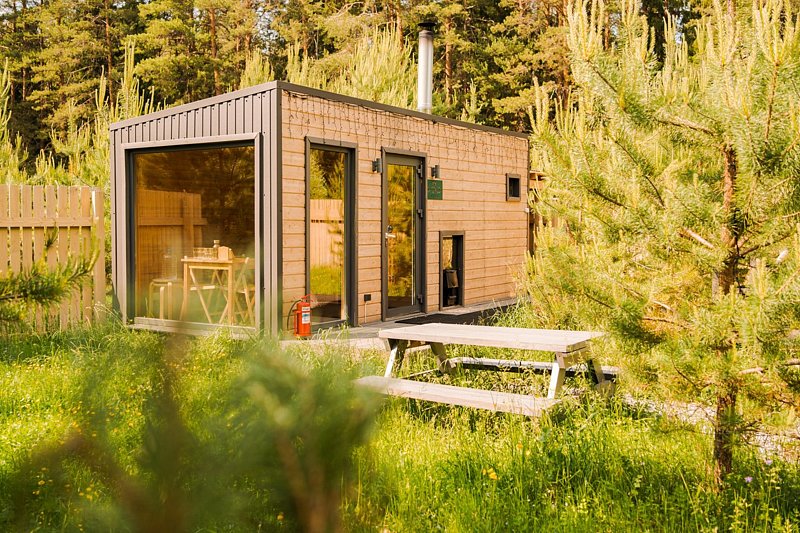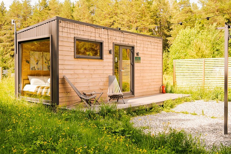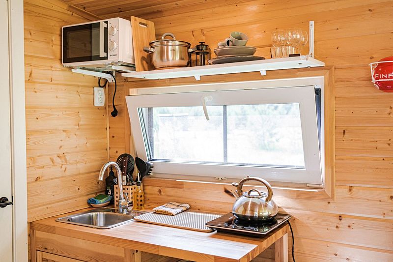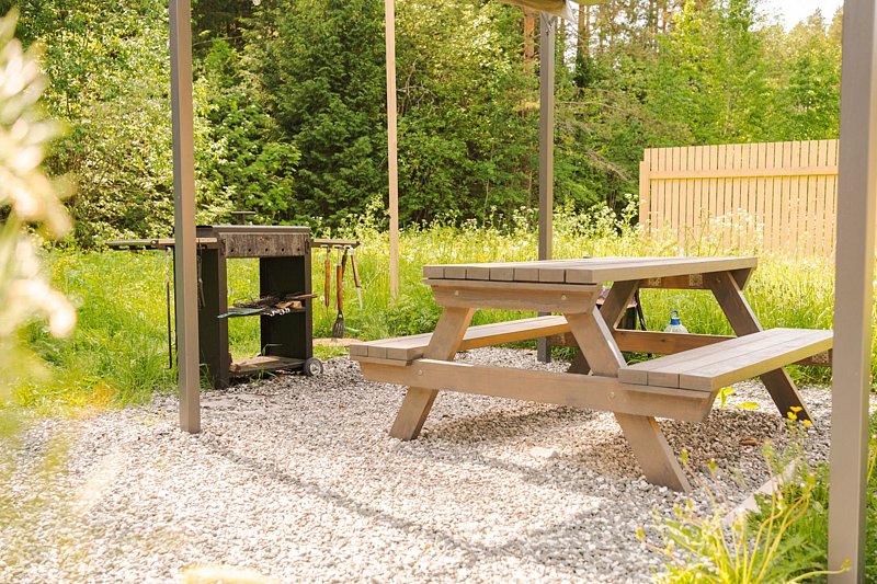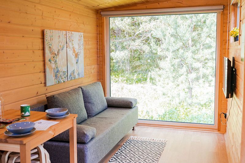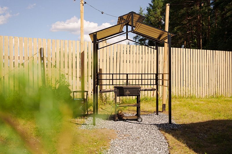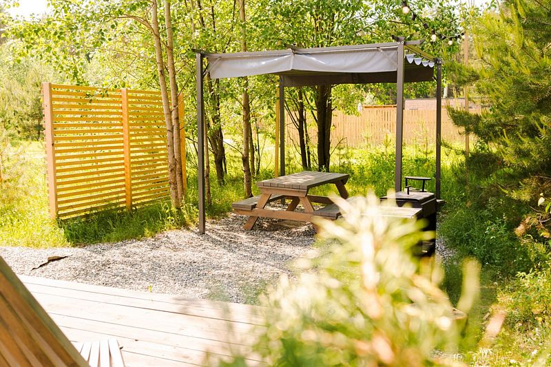 В доме с большим панорамным окном есть двуспальная кровать, кухня, холодильник с мини-баром и санузел с душем, есть терраса с мебелью и все принадлежности для барбекю.