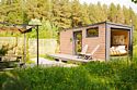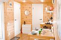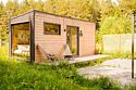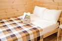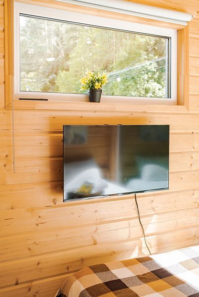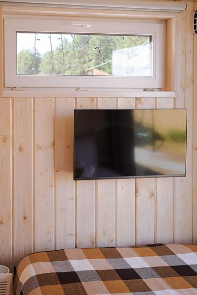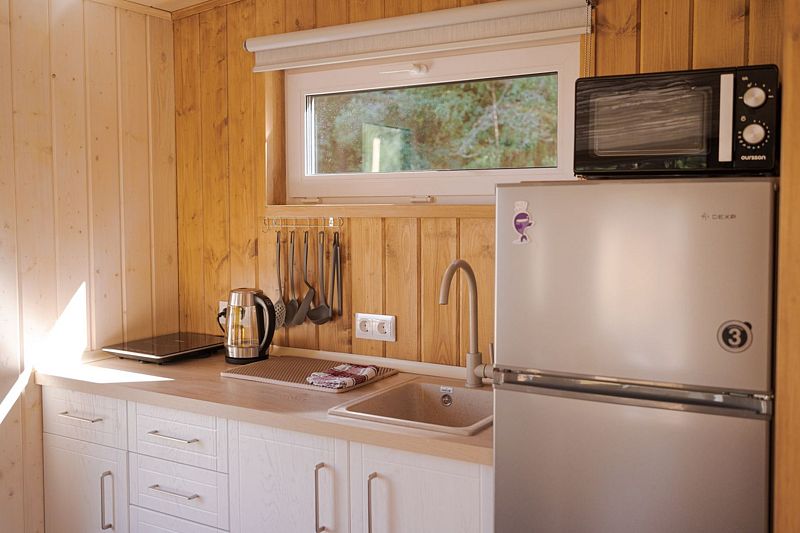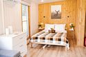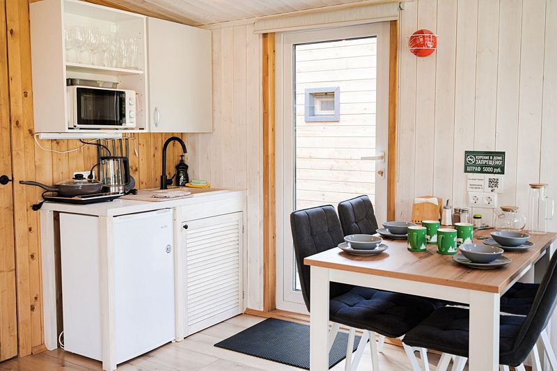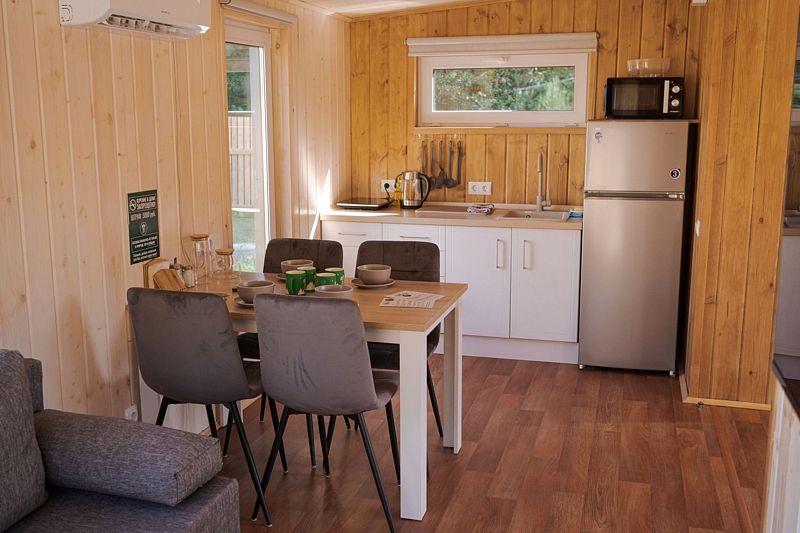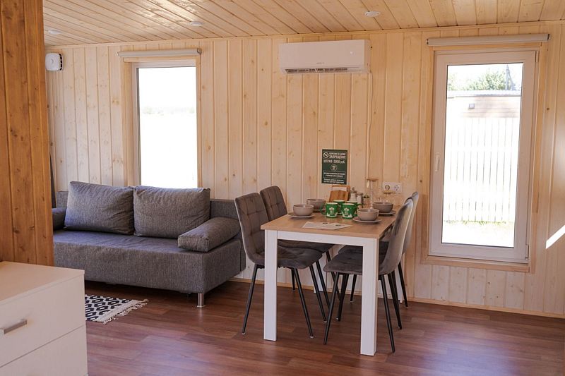 В доме на 4-х человек с большим панорамными окнами есть 2 комнаты: в одной из них находится двухспальная кровать, а в другой раздвижной диван, а также: кухня, холодильник с мини-баром и санузел с душем, есть терраса с мебелью и все принадлежности для барбекю.