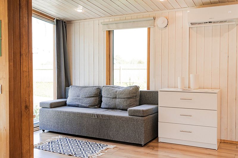 Дом для большой семьи или компании друзей. В доме находится двухспальная кровать и раздвижной диван, а также: кухня, холодильник с мини-баром и санузел с душем, есть терраса с мебелью и баней (баня оплачивается отдельно) и все принадлежности для барбекю.