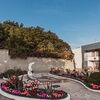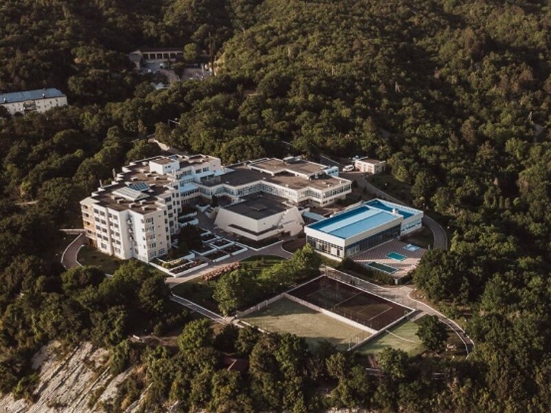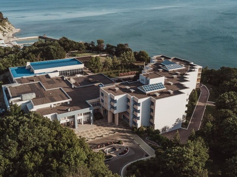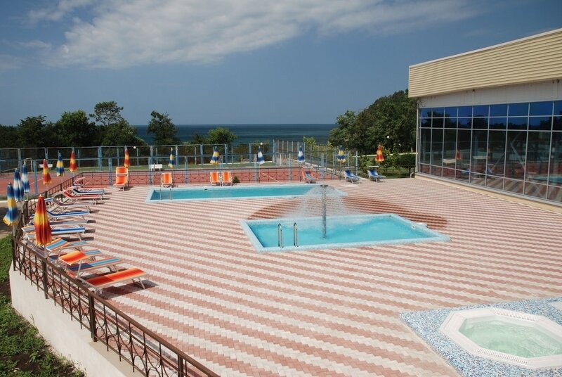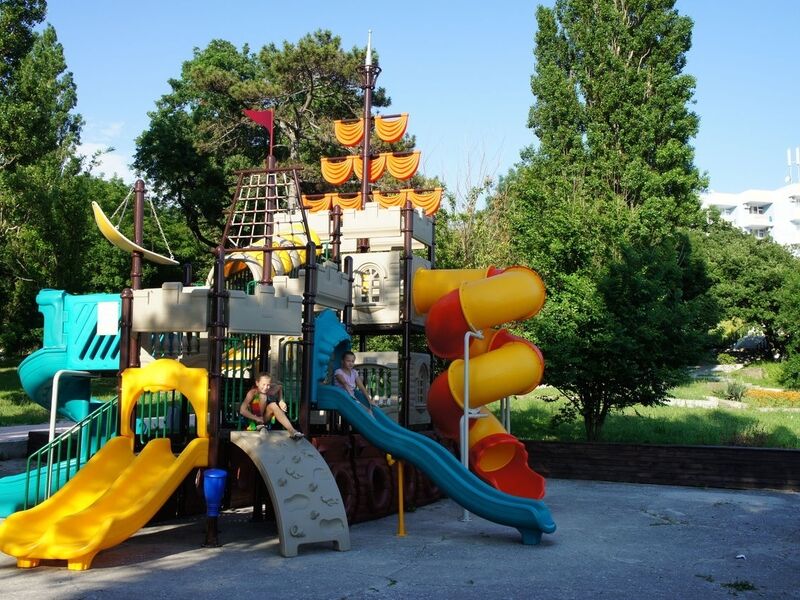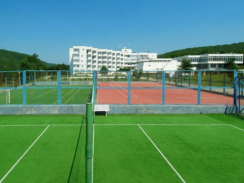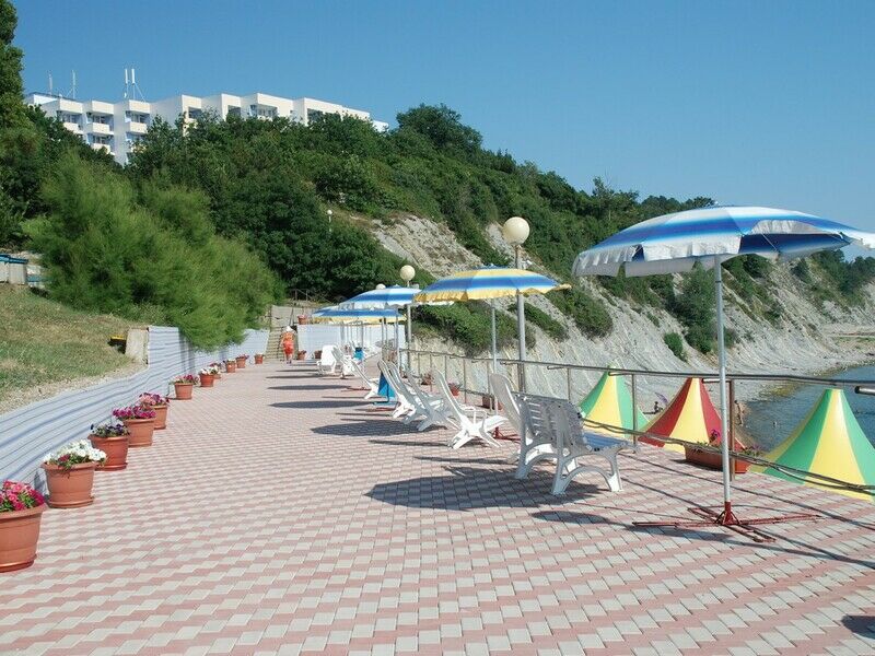 Территория дома отдыха большая , зелёная, с фонтанами и качелями, гуляли с удовольствием. Понравились смотровые лавочки над обрывом , они спрятаны в туях, приятно любоваться закатом. Прокат велосипедов детских трёх колёсных и взрослых , другого спортинвентаря , люди играли в теннис и футбол, около ресепшена магазинчик. До моря 120 ступенек , сначала сложно , потом привыкаешь, на каждом пролёте лавочки , можно отдохнуть. Туалеты и душ на пляже чистые , магазины.