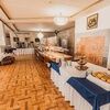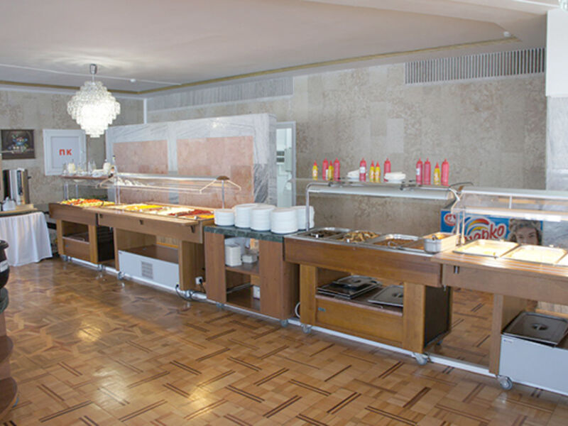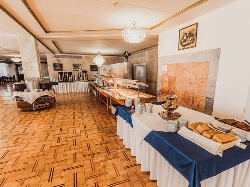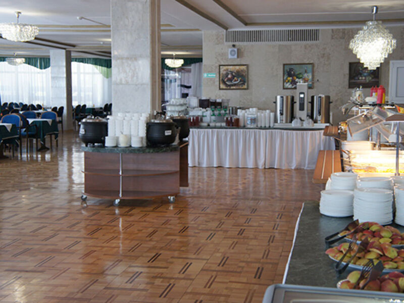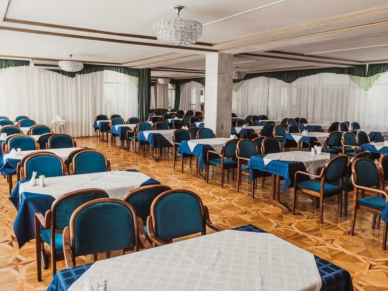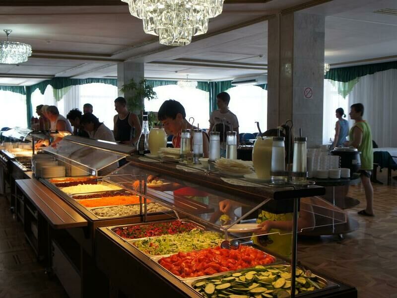 Столовая огромная ! Отель заполнен был весь , но в столовой места были всегда , детских стульчиков много. Еда вся тушёная и варёная, мясо и котлеты в нескольких вариантах, один вид рыбы всегда , овощи сырые , тушёные, в виде салатов и так внарезку , соевый соус , уксус , масло , сметана , майонез, горчица отдельно , блинчики и яйца свежие жарят , к ним мёд и сгущёнка. Тут просьба к администрации - сделайте еще варенье к блинчикам , все равно фрукты остаются с обеда и ужина. На завтрак вкусные сыр , творог , запеканки и омлеты, выпечка каждый раз, особенно понравились осетинские пироги с сыром и зеленью . На завтрак и ужин кофе зерновой из двух кофемашин , зерна засыпают хорошие , можно пить. Алкоголя в доме отдыха нет , но можно купить в хорошей пятёрочке в бжиде , в столовую брали вино в термокружке .