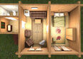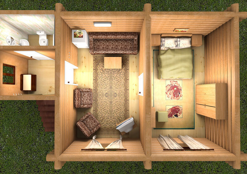 Двухкомнатный домик (45м2). Спальня, гостиная, прихожая, ТВ, холодильник с морозильной камерой, сплит-система, обогреватель, душ с горячей водой, умывальник и туалет.