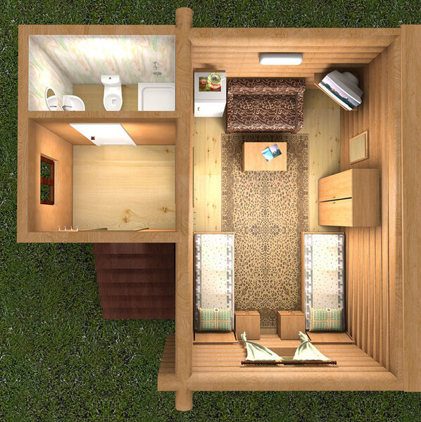 Однокомнатный домик (25м2). Спальня, прихожая, в номере две кровати, раскладывающийся диван, ТВ, холодильник с морозильной камерой, сплит-система, обогреватель, душ, умывальник и туалет.