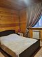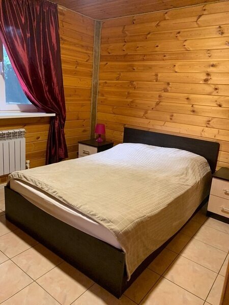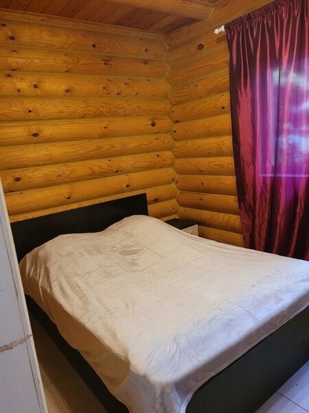 В доме две спальни. В первой спальне двуспальная кровать, 2 прикроватные тумбы со светильниками, стул, ТВ. Во второй спальне двуспальная кровать, прикроватная тумба, стул, светильник, ТВ. В доме есть открытая небольшая веранда со столом и лавками на шесть человек. На улице, перед домом своя огороженная территория с мангальной зоной, зеленые насаждения
