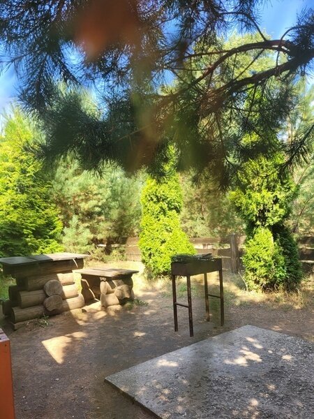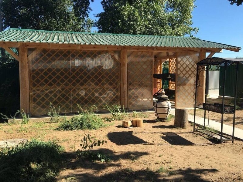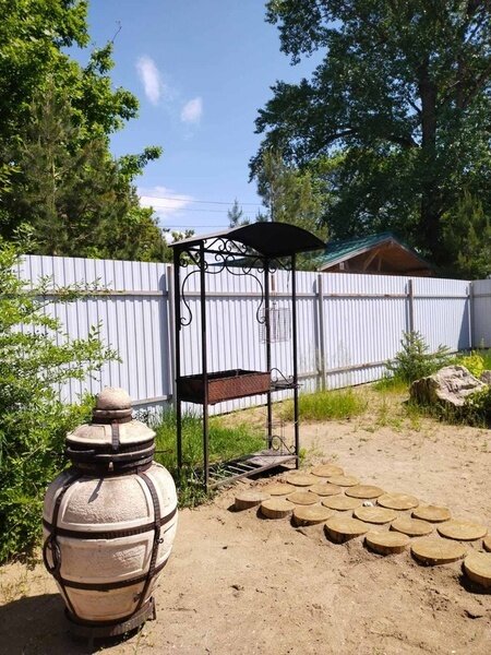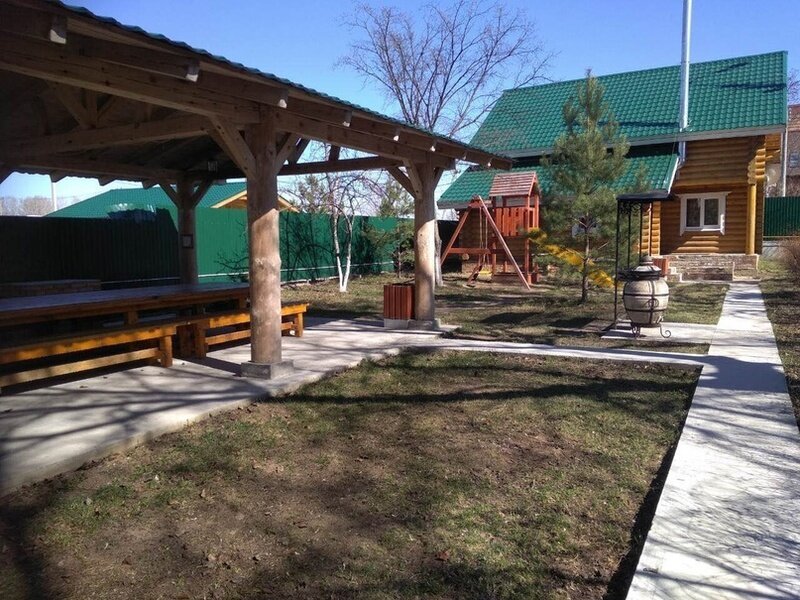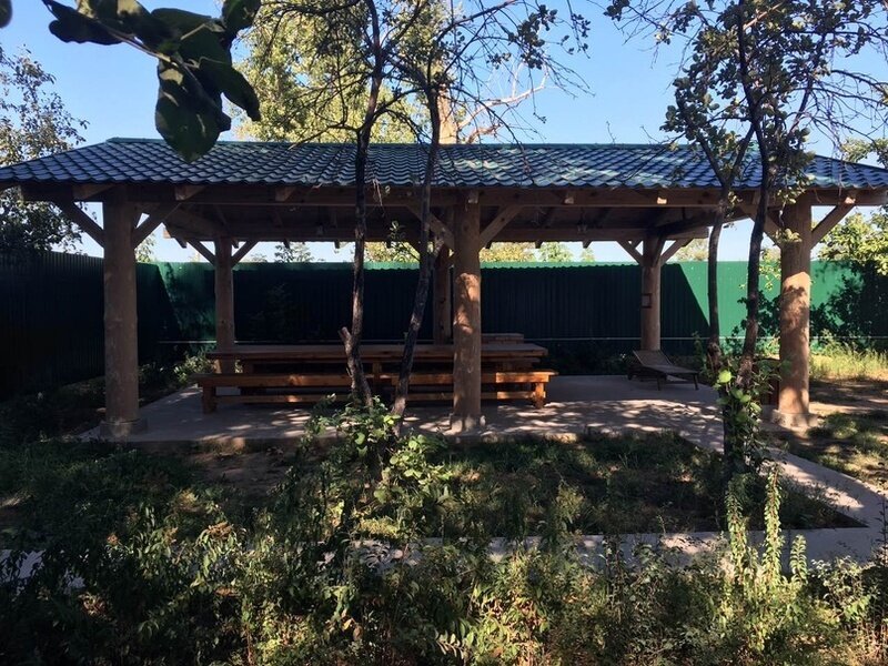 Около дома большая беседка рассчитанная на 20 человек, с освещением, розеткой, массивным деревянным столом и лавками, разделочным столом. Свой мангал.