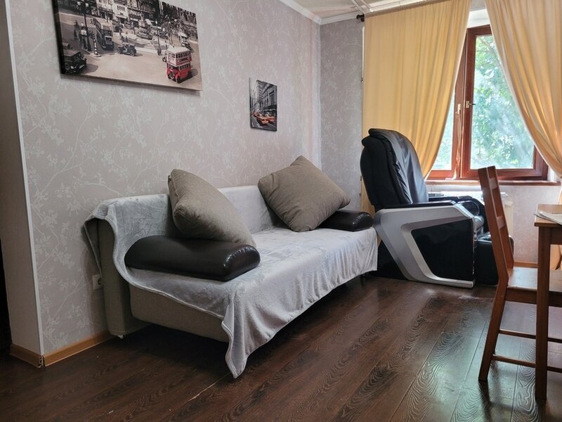 На кухне есть холодильник, чайник, газовая плита, столовые приборы, посуда (тарелки, бокалы, стаканы, рюмки) на 6 персон. Есть раскладной диван.