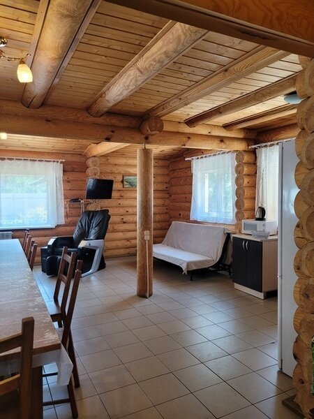 На первом этаже расположена большая гостиная с кухонной зоной и всей необходимой бытовой техникой (холодильник, плита, электрочайник, посуда на 20 персон: тарелки, бокалы, стаканы, рюмки, столовые приборы, сковорода), большой деревянный стол, стулья, два двуспальных дивана, плазменный телевизор с USB, массажное кресло;