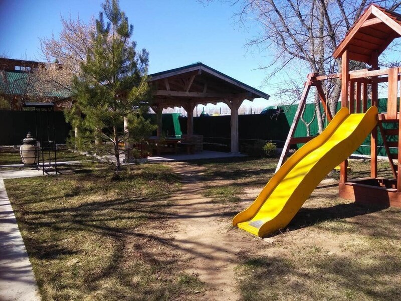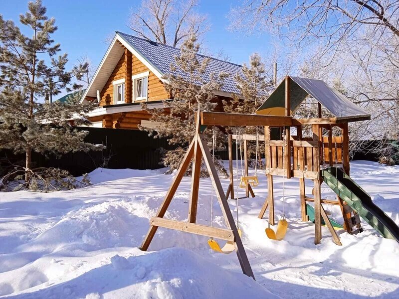 Срубовой двухэтажный коттедж со своей большой огороженной территории, с зелеными насаждениями, большой уютной беседкой, детским игровым комплексом.