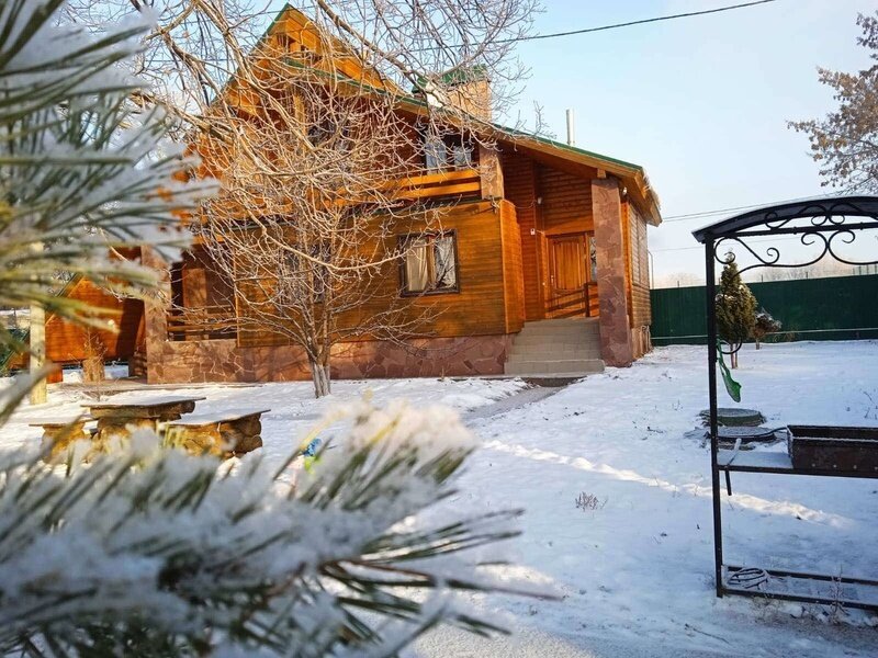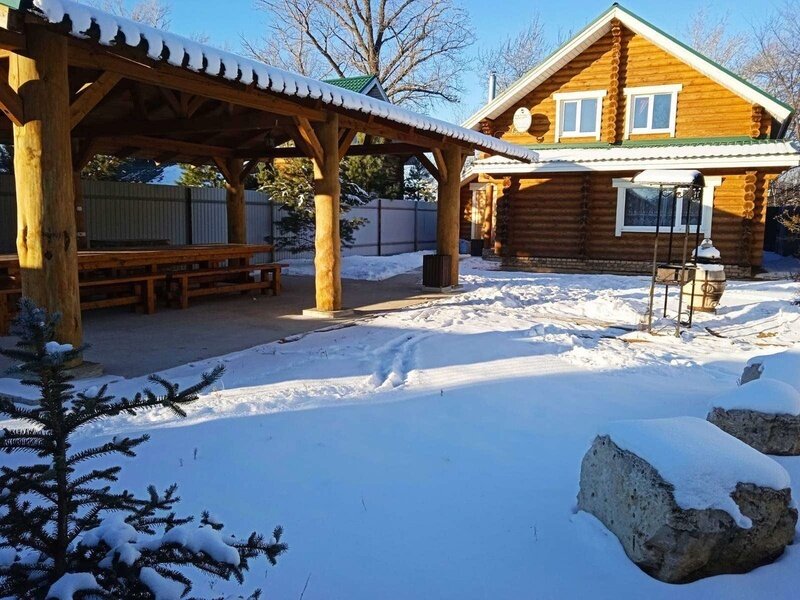Около дома большая беседка с освещением, электрической розеткой, массивным большим деревянным столом и лавками, разделочным столом. Беседка вмещает 20 человек. Рядом мангал.