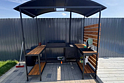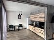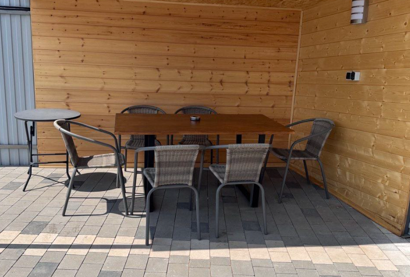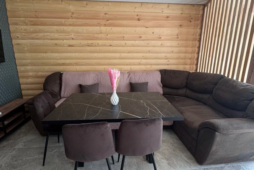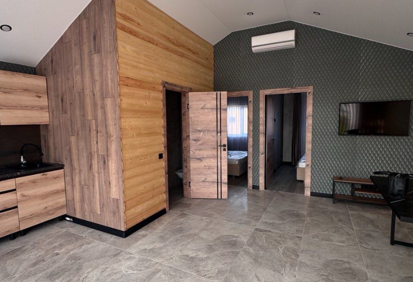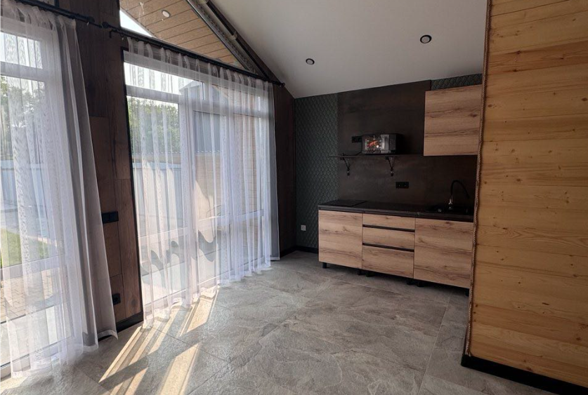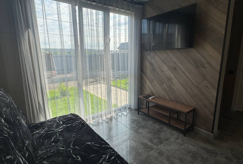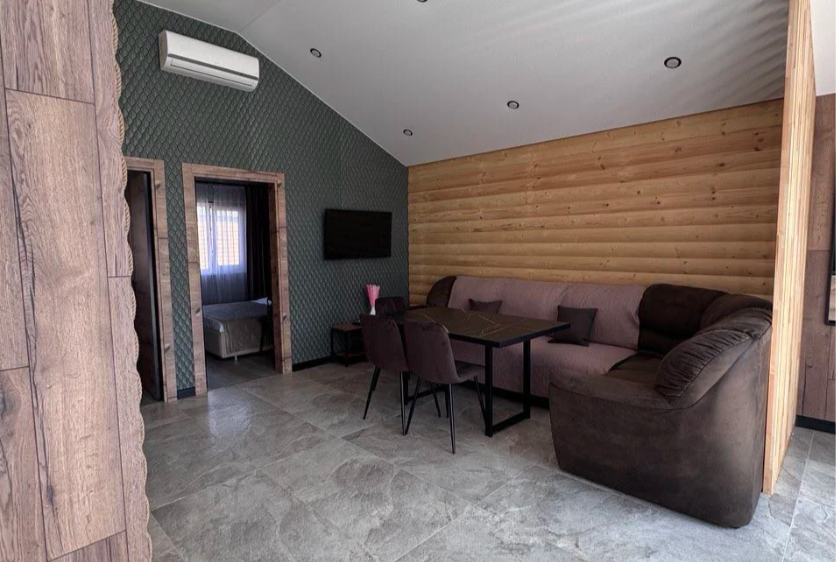 Просторная гостиная с музыкальной аппаратурой, телевизором и столом на 6 гостей, совмещенная с кухней, санузел с душем, выход на террасу.