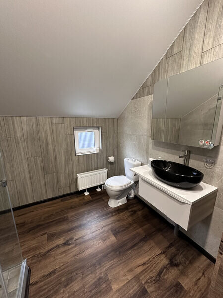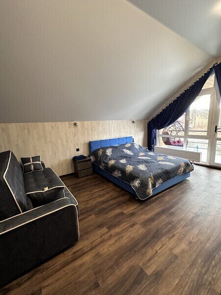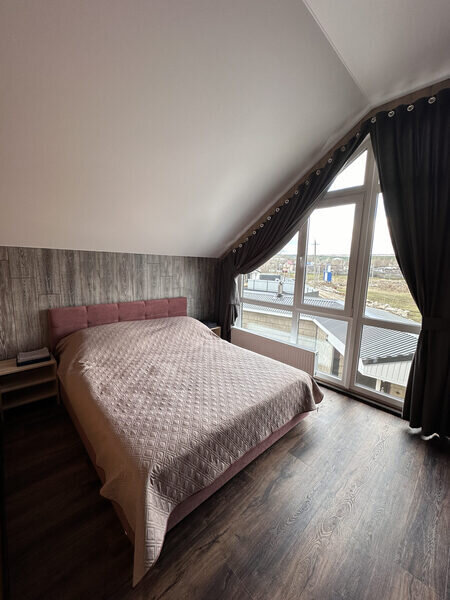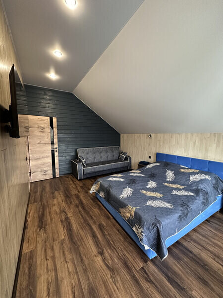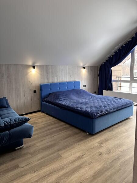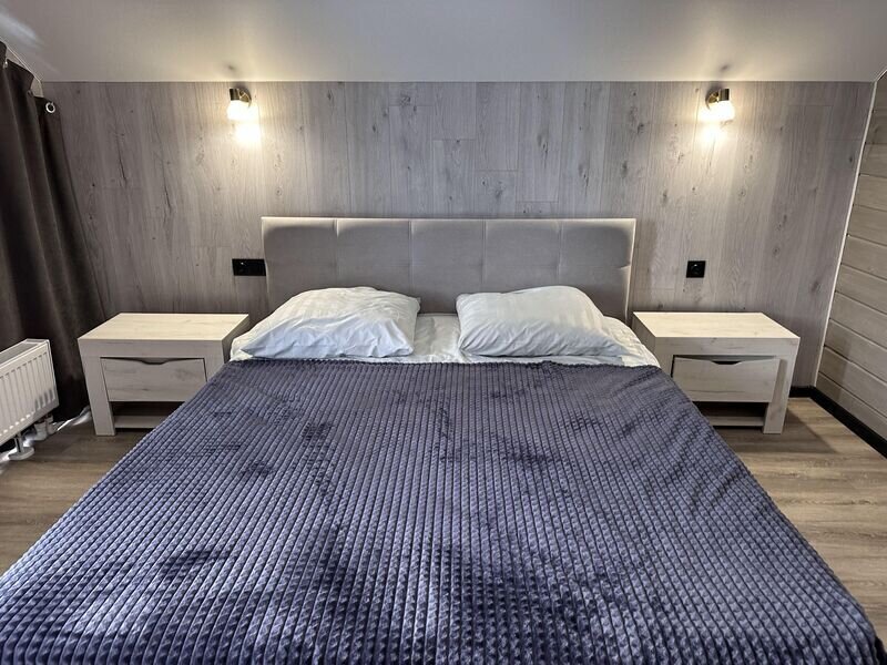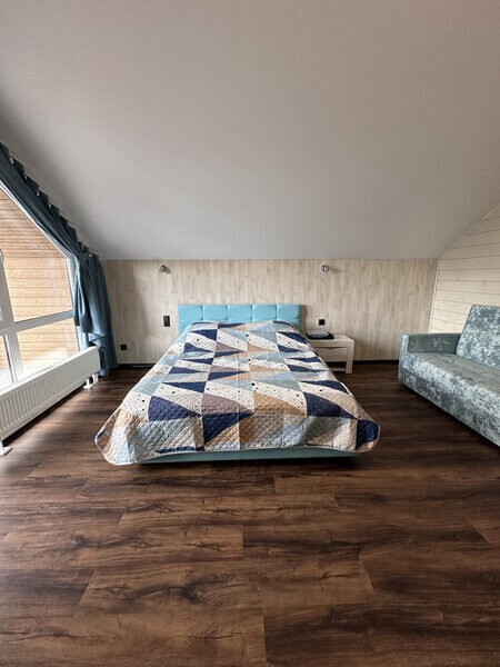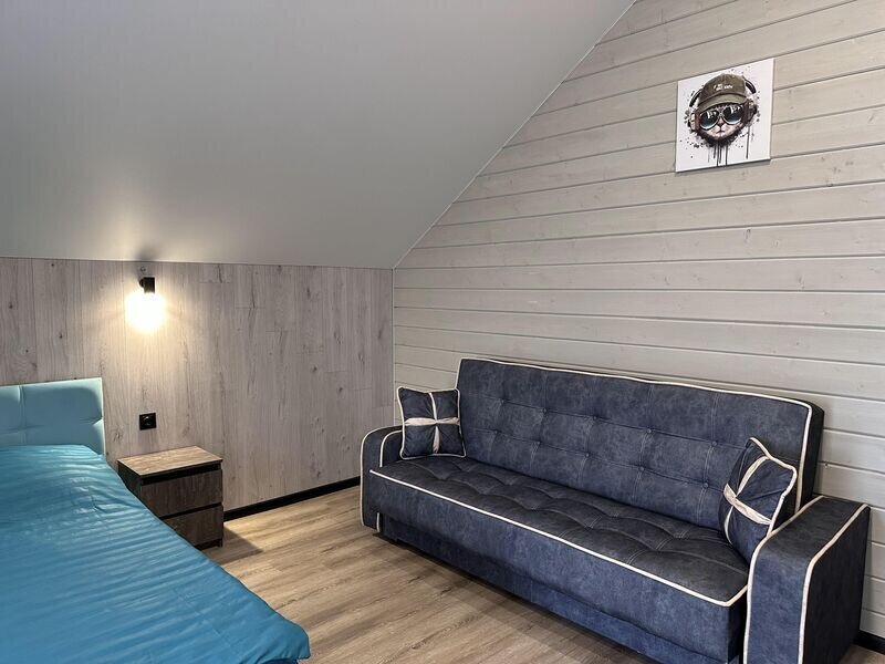 На 2 этаже: 2 спальни в каждой двуспальная кровать, двуспальный диван и санузел.
