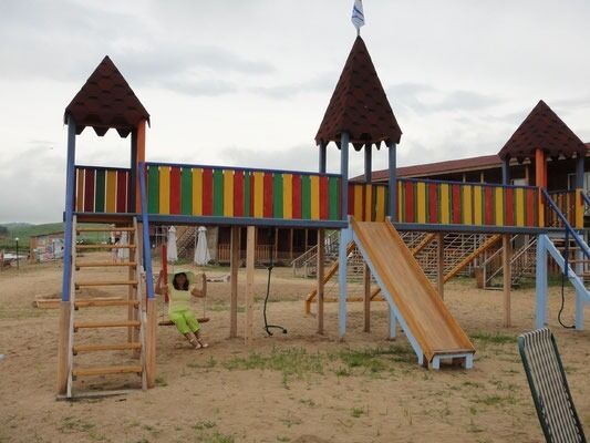 Детская площадка: городок, качели, песочница, бассейн. Надувной батут за отдельную плату, по времени.