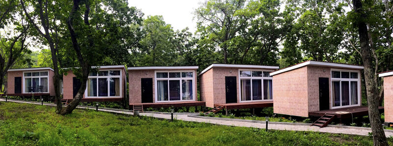 Имеют отдельную парковку для автомобилей, домик состоит из двух комнат, первая комната - гостиная - набор мягкой мебели (двуспальный раскладной диван, кресла), столик, телевизор. Вторая комната – спальня, оборудованная одной двуспальной или двумя односпальными кроватями.