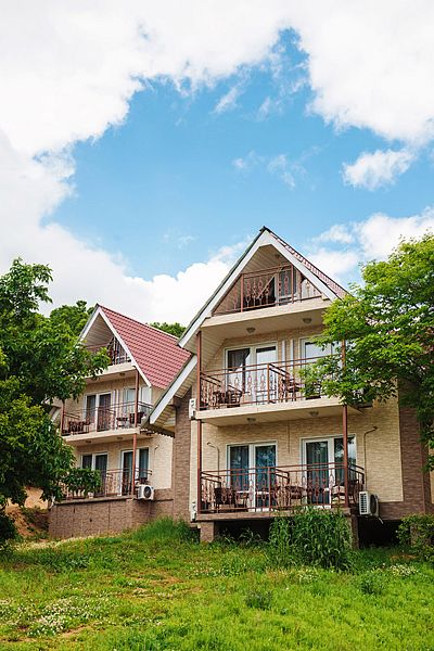На территории базы отдыха располагаются 8 индивидуальных домов с балконом. Большие летние дома площадью 20 м. кв. четырехместного размещения имеют открытый балкончик, расположены на возвышенности, с которой открывается чудесный вид. Дома, стоят в одну линию и обращены к морю, расстояние между домами в ряду два метра. Изготовлены из натурального дерева. Перед домами большая площадка с беседками.