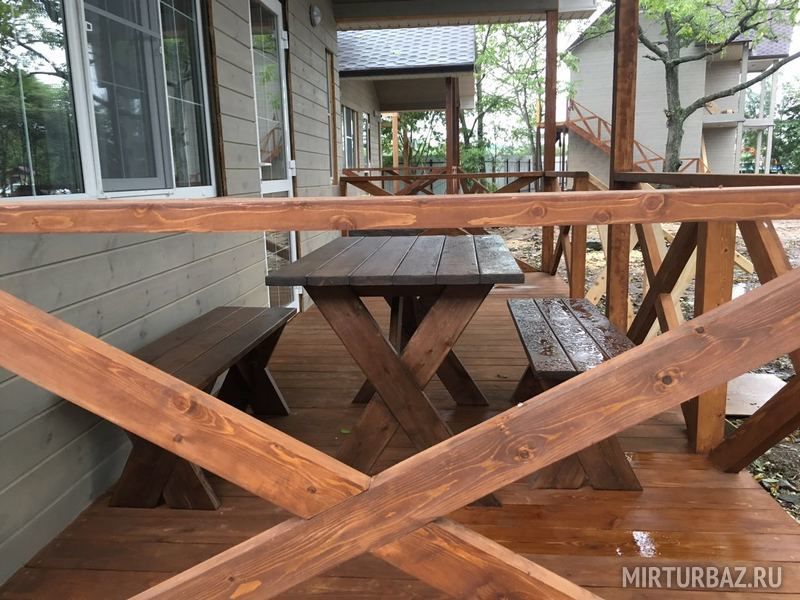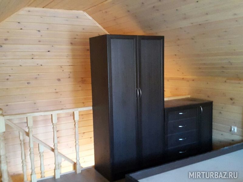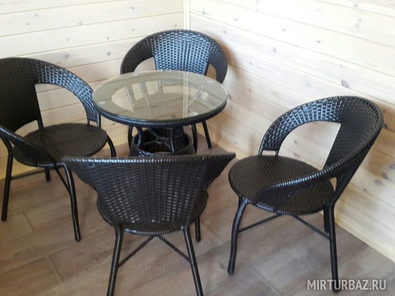 2 этаж: Большой балкон с зоной отдыха, комод, шкаф, тумбочки, телевизор, комплект постельного белья. Так же у домика имеется большая веранда с зоной отдыха.