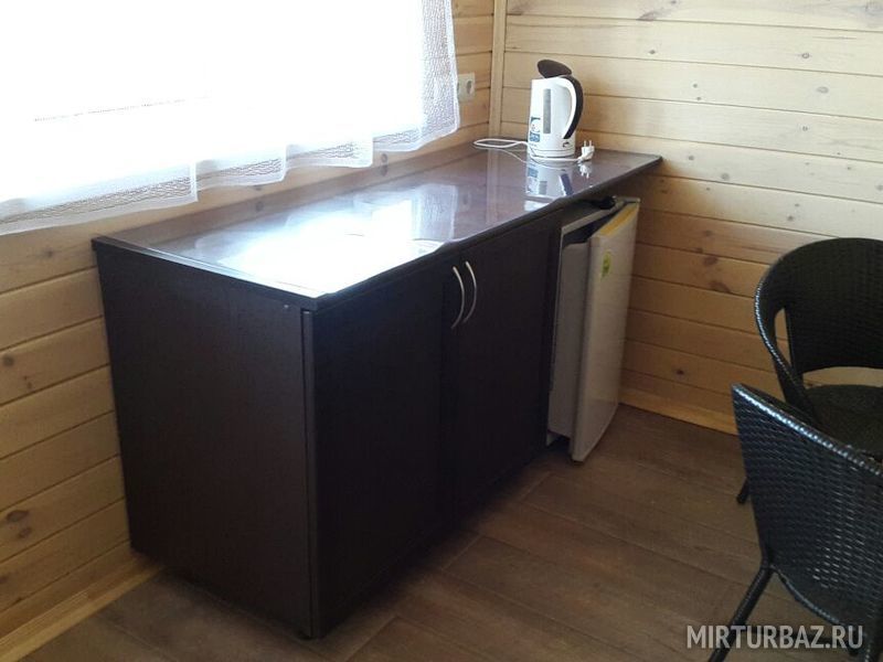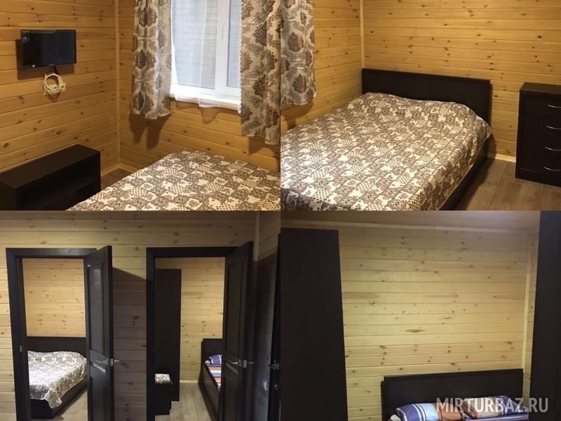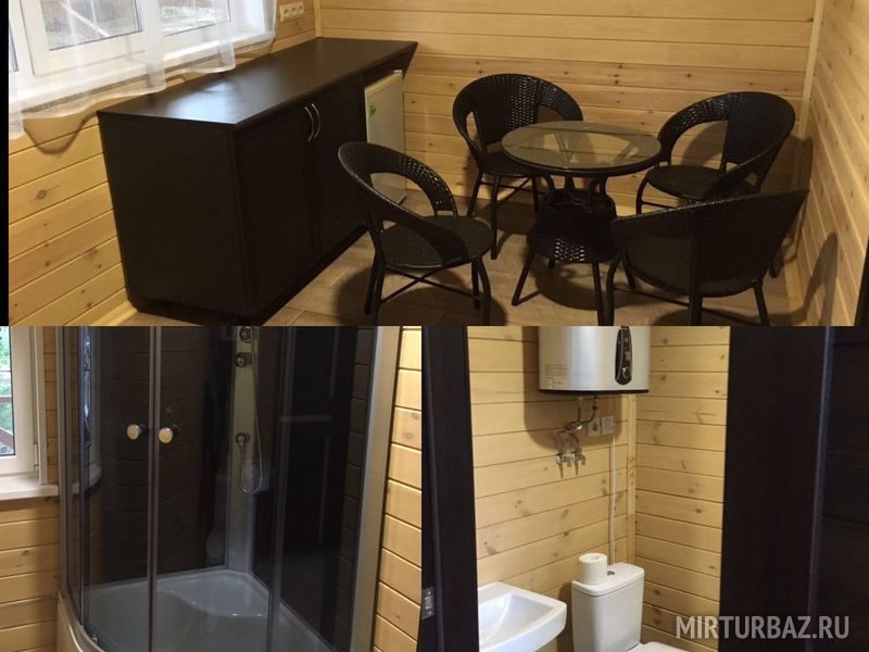 В доме 2 спальных комнаты и небольшая кухонная зона. Столик со стульями, чайник, холодильник, посуда, шкаф, комод, тумбочки, 2 двухспальные кровати, телевизор в каждой комнате, комплект постельного белья, полотенца. Ванная комната: бойлер, душевая кабина, туалет, раковина, зеркало. Так же у домика имеется большая веранда с зоной отдыха.